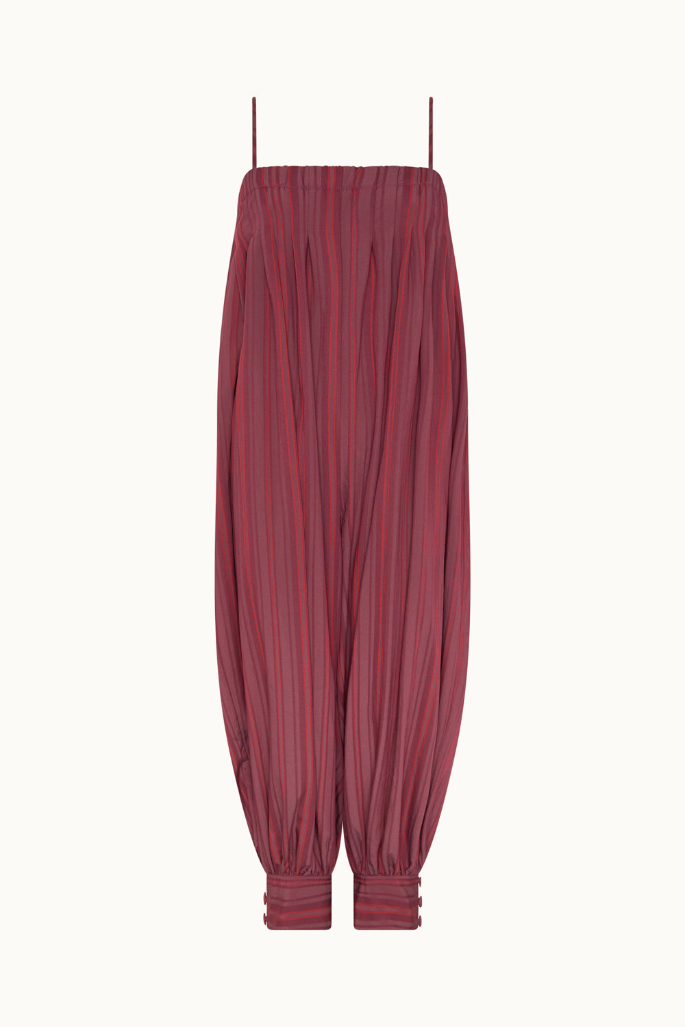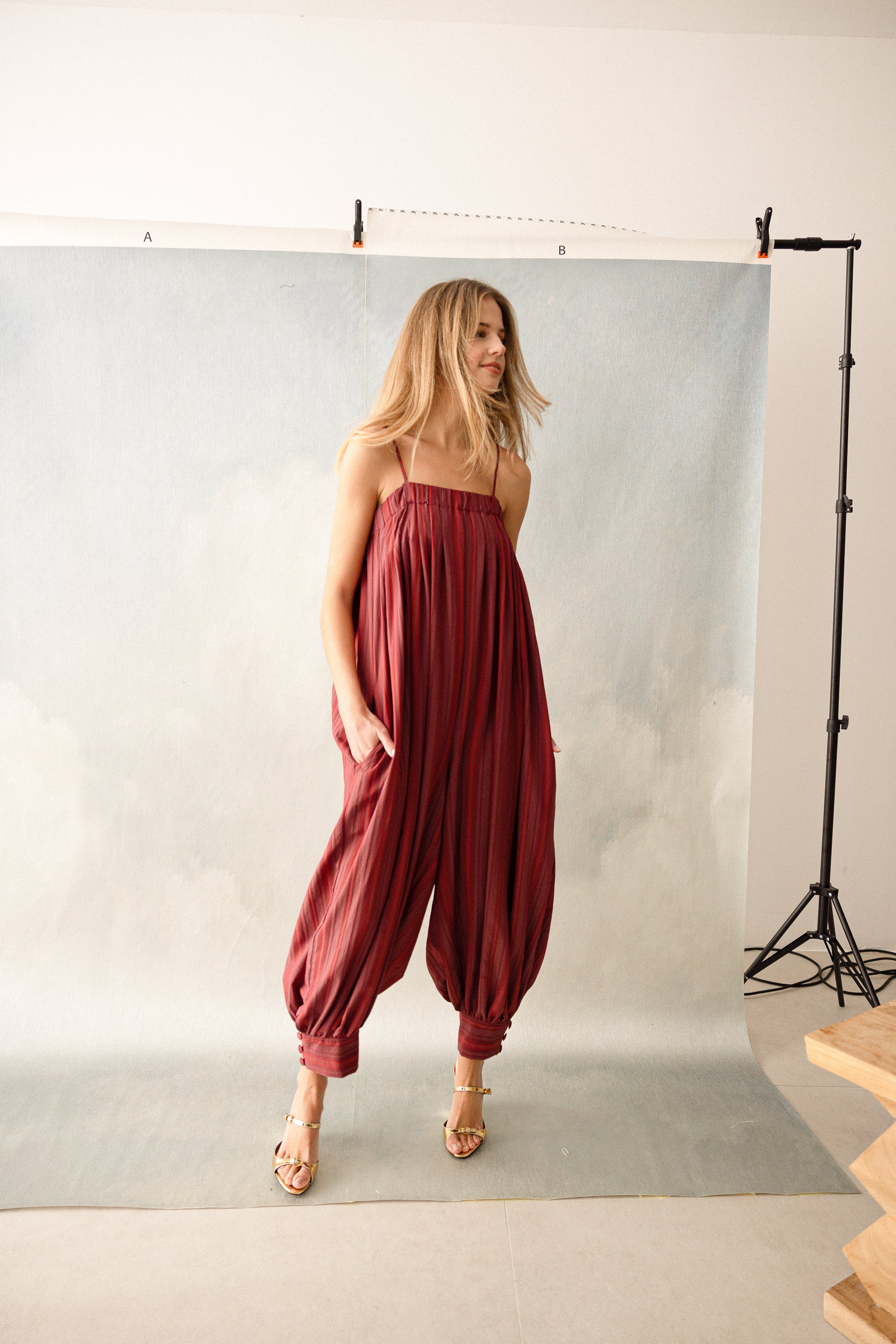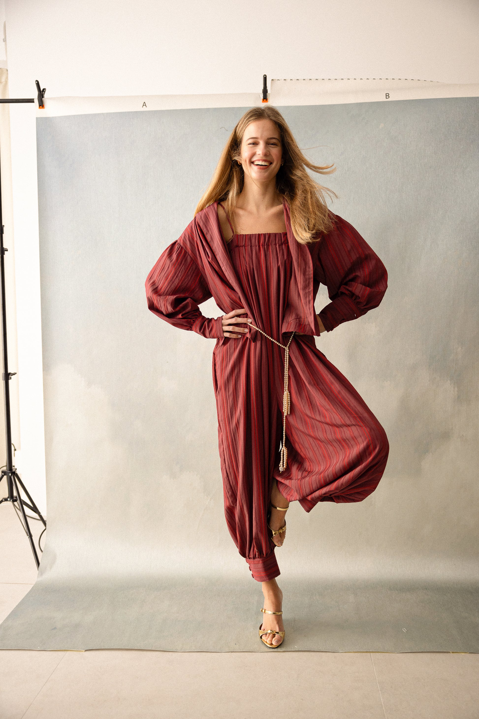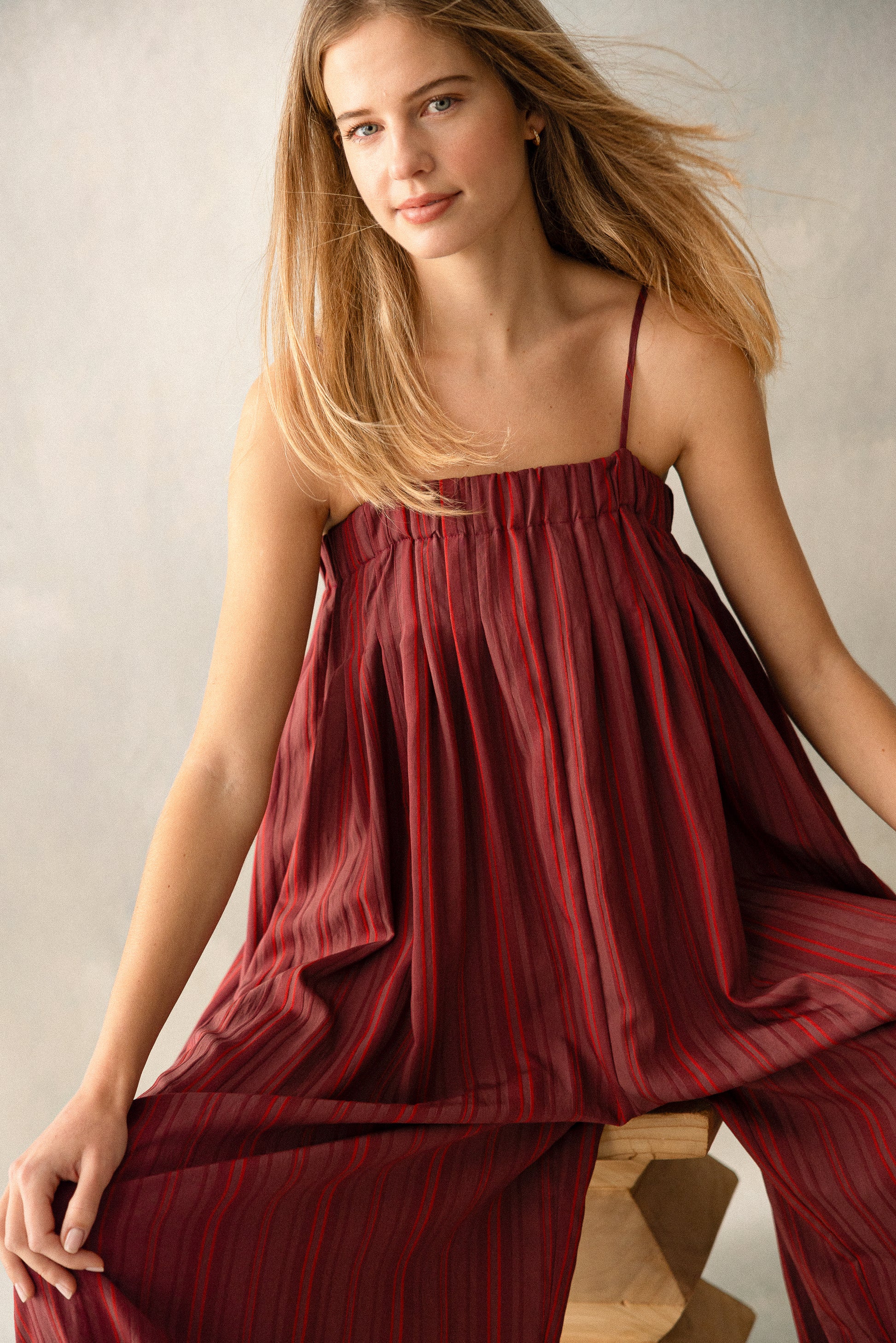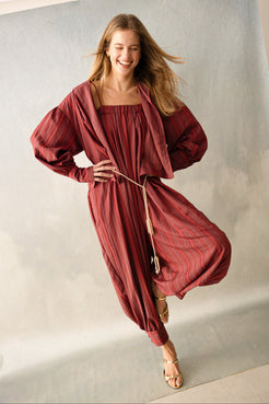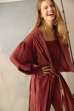 Acacia is a beige striped dress in a linen and cotton fabric. It has a gathered halterneck with a bow that you can a...