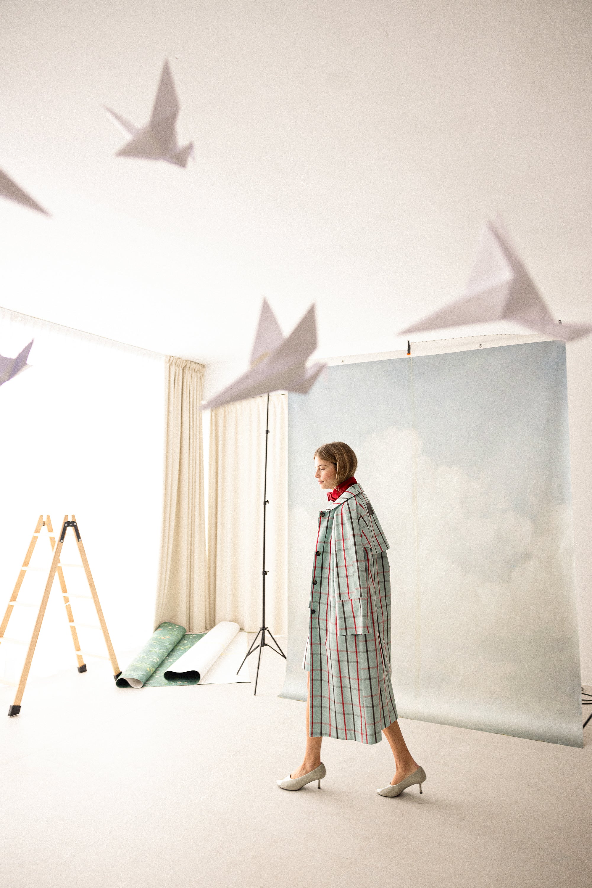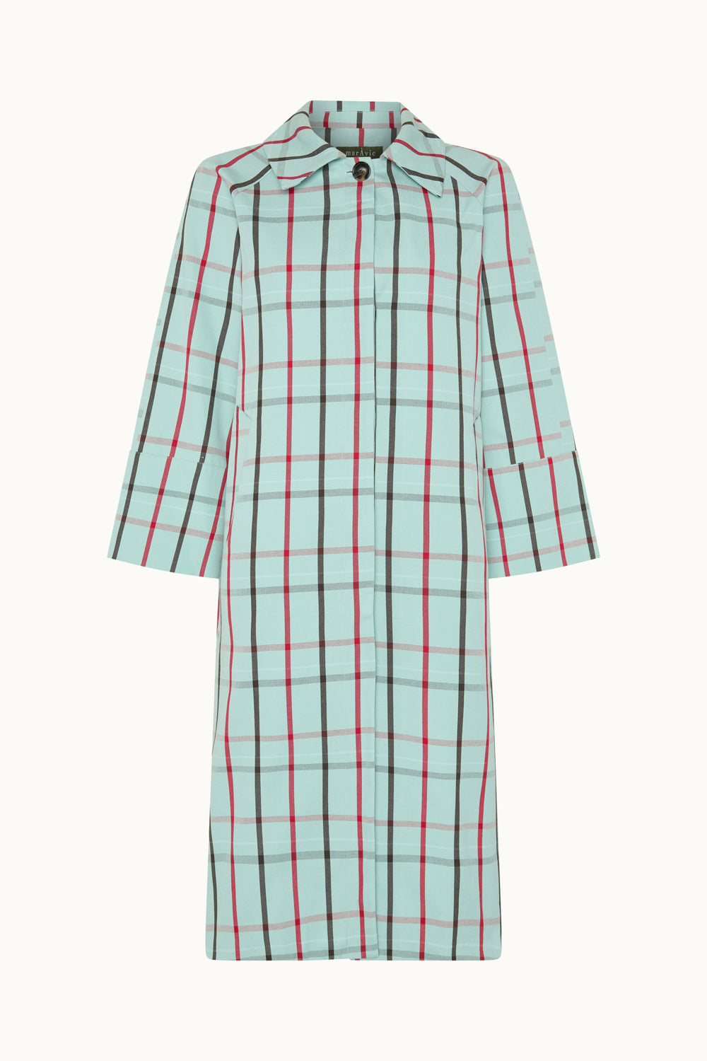 Gabardina a cuadros azul. Confeccionada en un tejido 100% algodón. Cierre frontal con botones ocultos y dos bolsillos...
