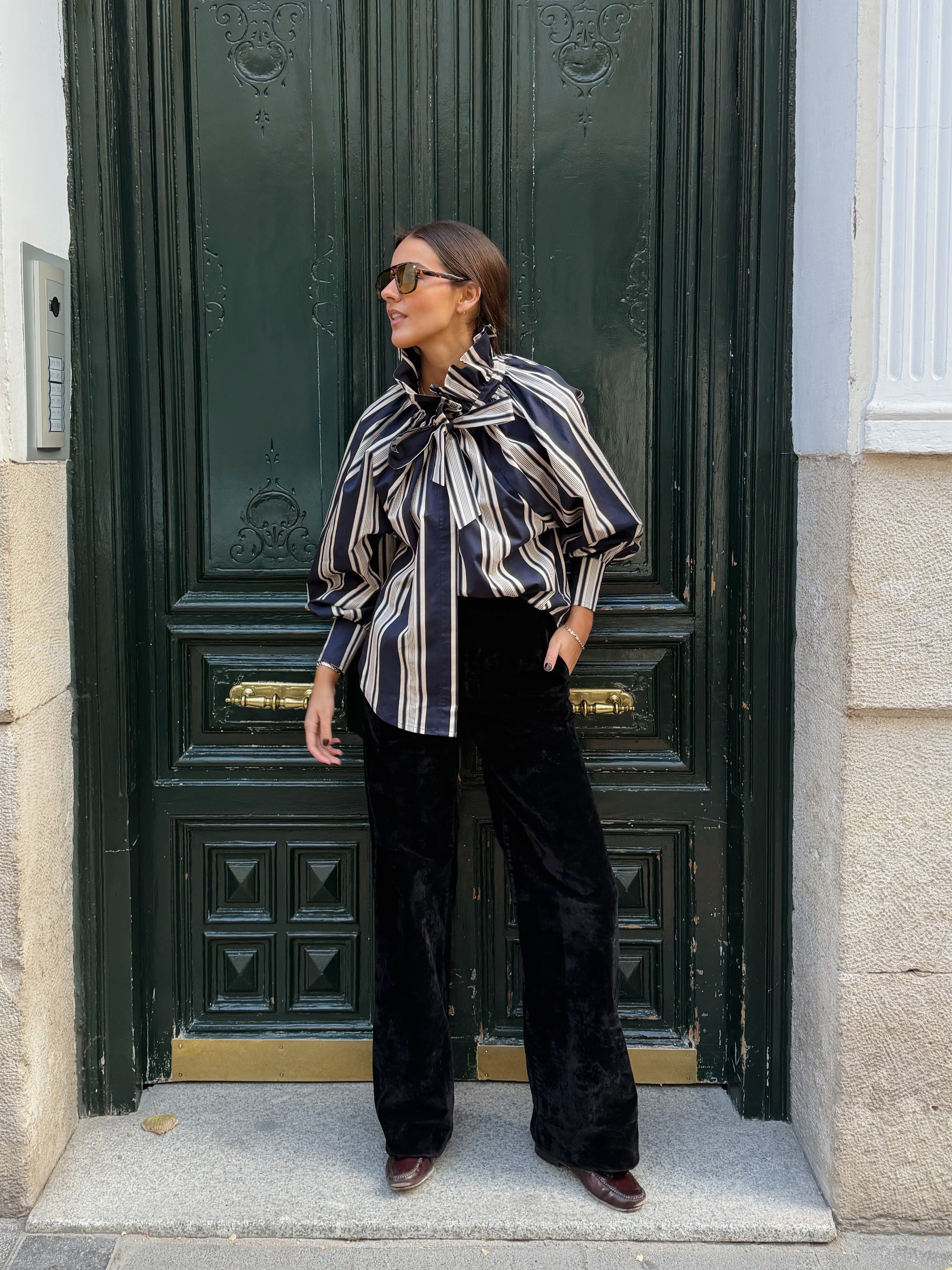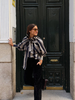 Camisa a rayas azul y blanca. Cuello con volante y lazo. Mangas abullonadas terminadas en puño. Cuello adornado con una flor de accesorio. Confeccionada en 100% algodón.