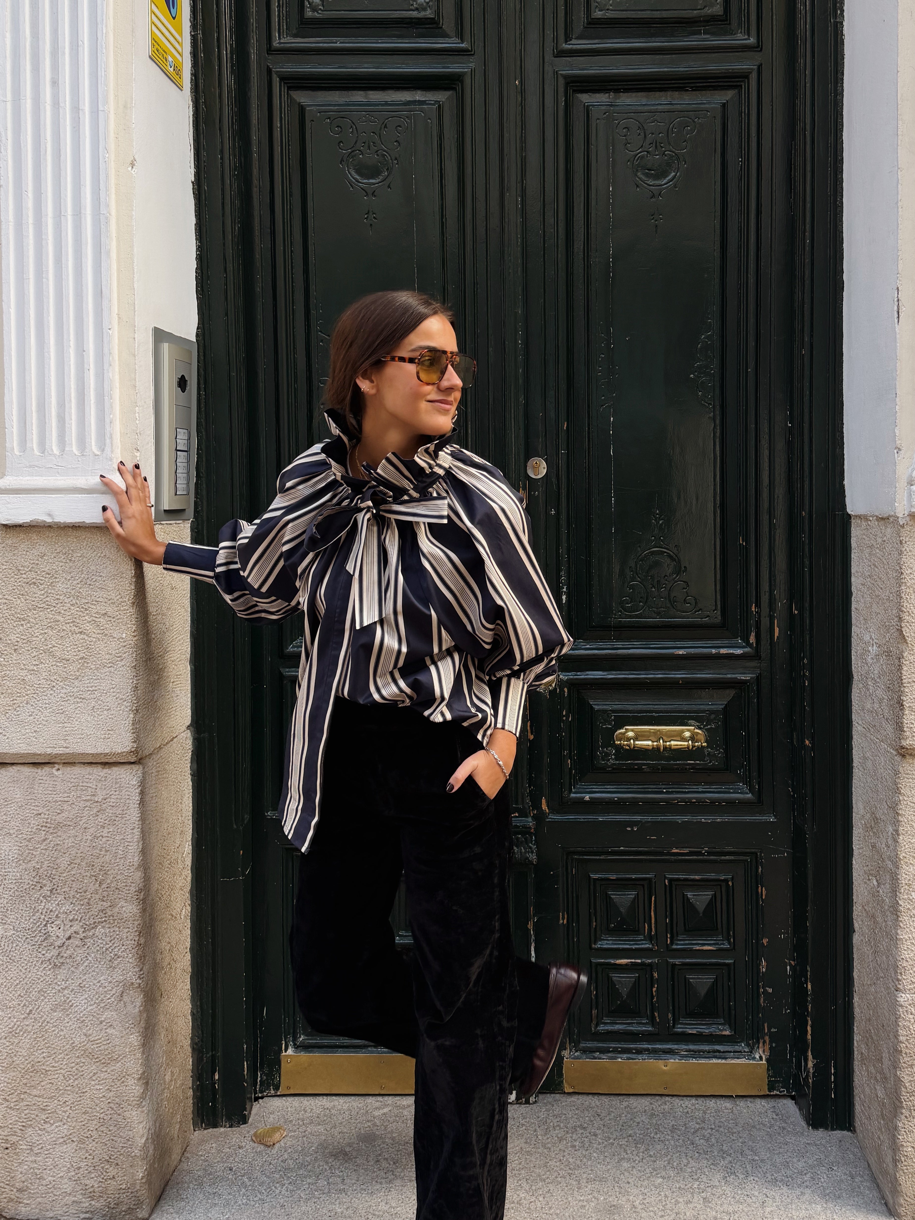 Camisa a rayas azul y blanca. Cuello con volante y lazo. Mangas abullonadas terminadas en puño. Cuello adornado con u...