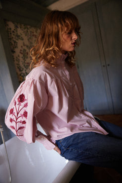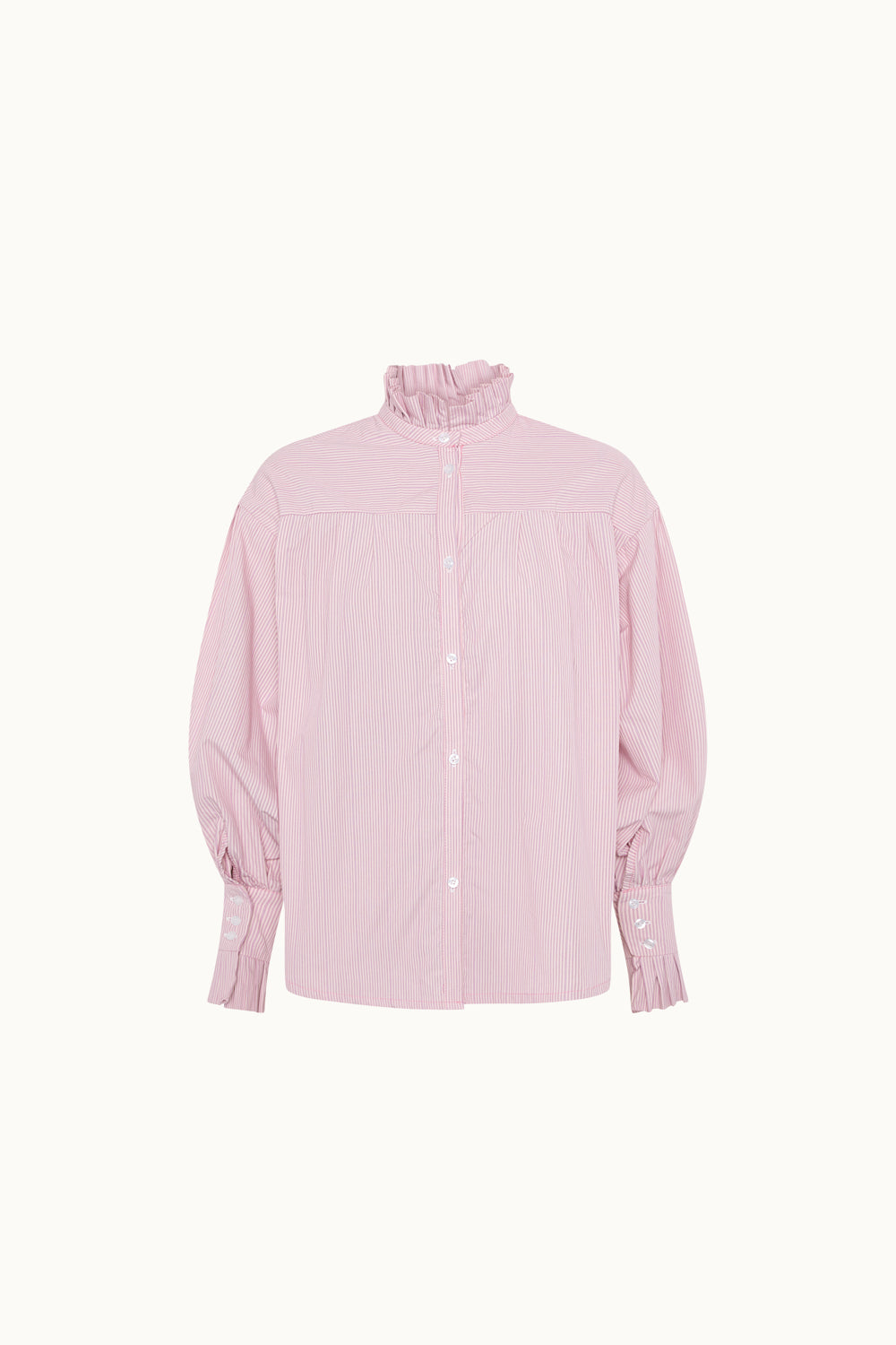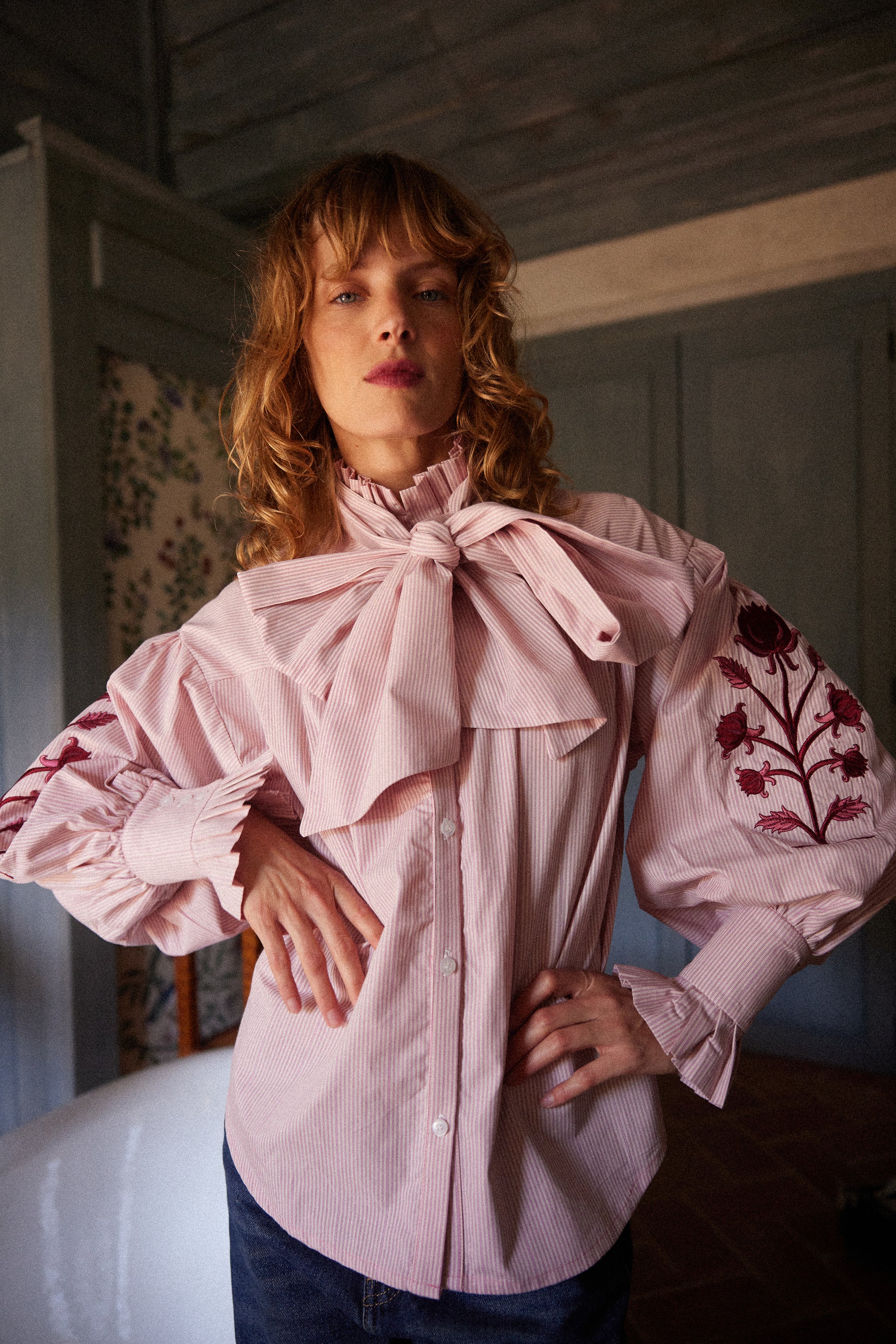 Camisa a rayas roja. Confeccionada en un tejido 100% algodón. Cuello con volante y lazo, mangas abullonadas y puños con volantes. Manga bordada.