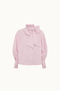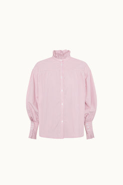 Camisa a rayas roja. Confeccionada en un tejido 100% algodón. Cuello con volante y lazo, mangas abullonadas y puños c...