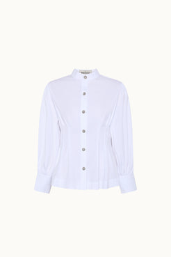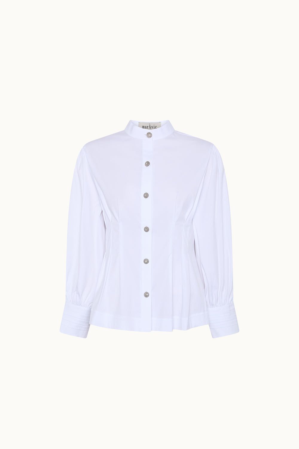 Camisa blanca con botones joya. Cintura ceñida, cuello mao y mangas abullonadas.