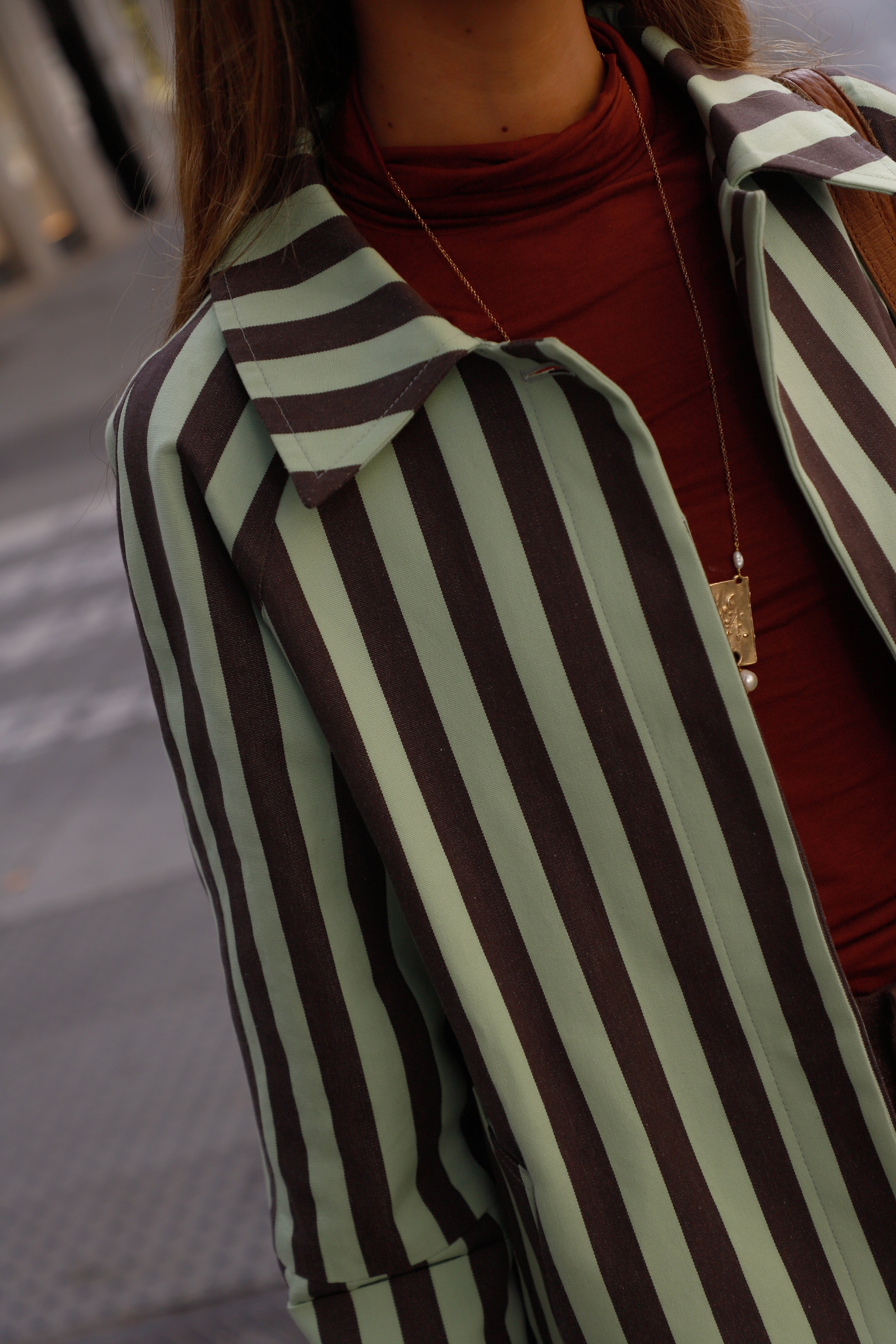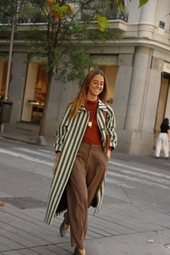Gabardina a rayas verde y marrón. Confeccionada en un tejido 100% algodón. Cierre frontal con botones ocultos y dos b...