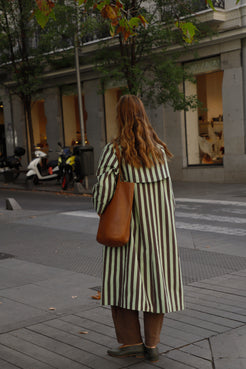 Gabardina a rayas verde y marrón. Confeccionada en un tejido 100% algodón. Cierre frontal con botones ocultos y dos bolsillos con solapa en el delantero. Parche de piel a la espalda. Forro de algodón.