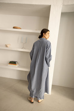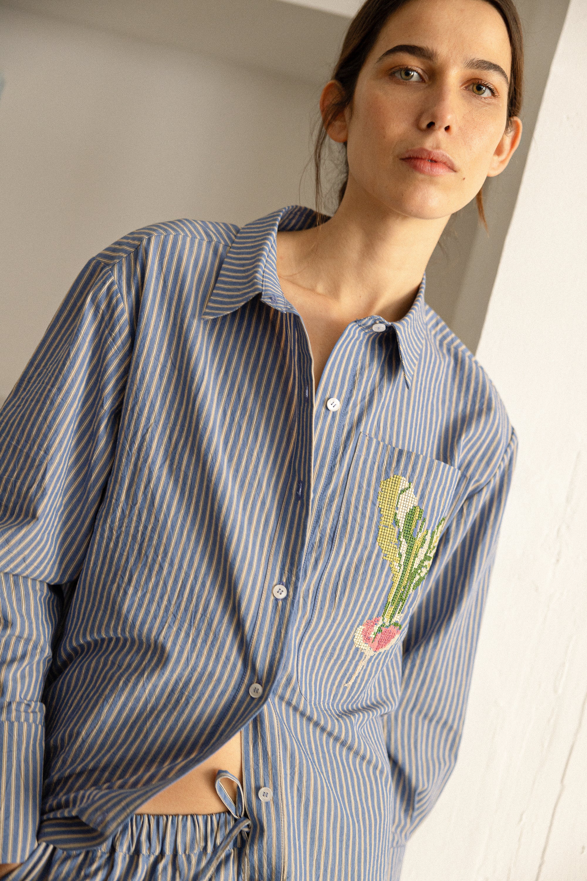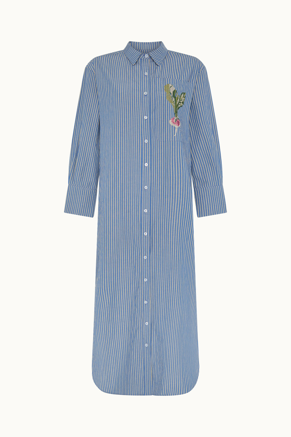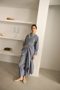 Vestido camisero Carlota a rayas azules y blancas y una flor bordada. Con él te sentirás estilosa y guapa, y ala vez cómoda para cualquier plan. Sabemos que te va a encantar.