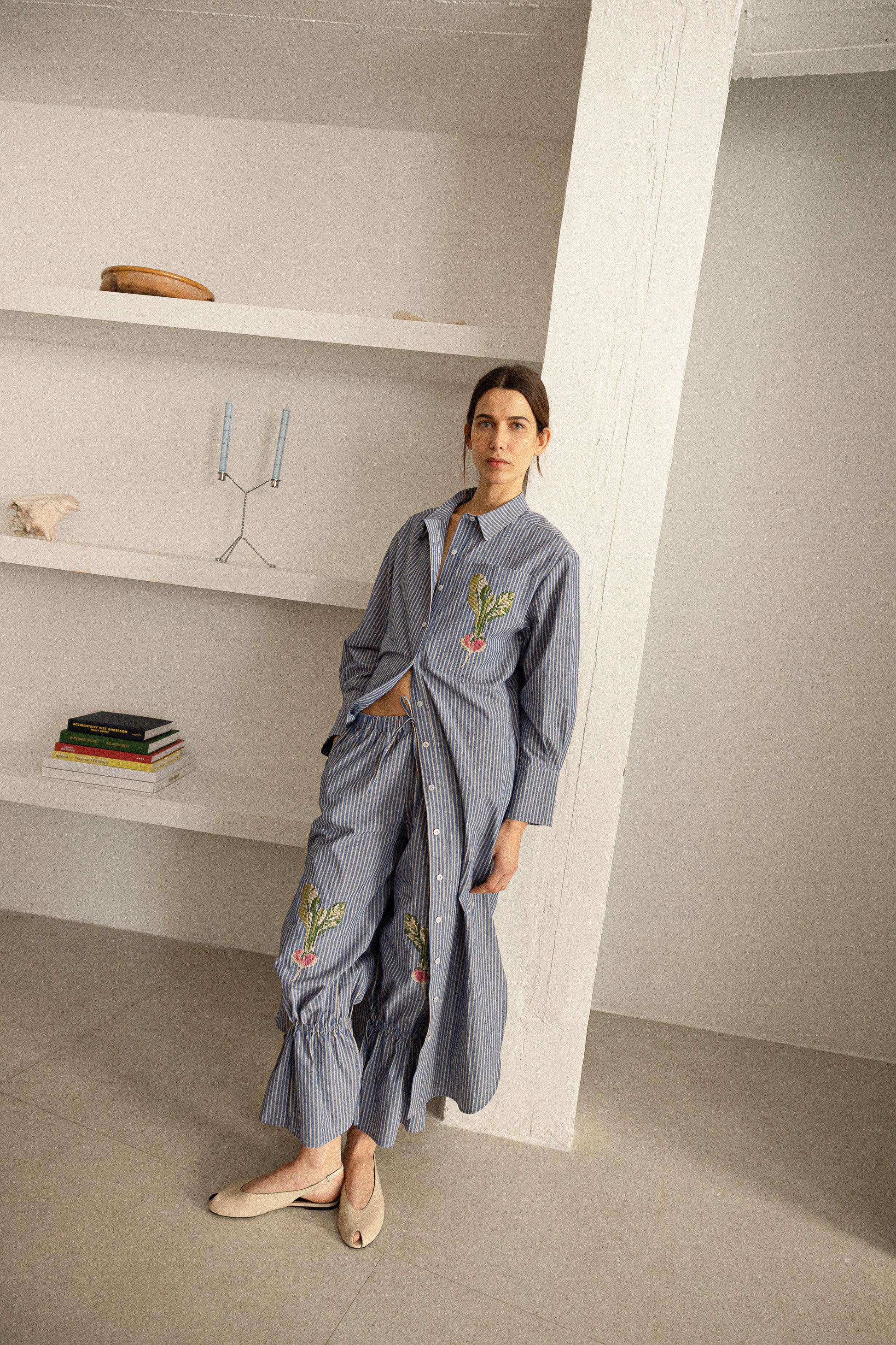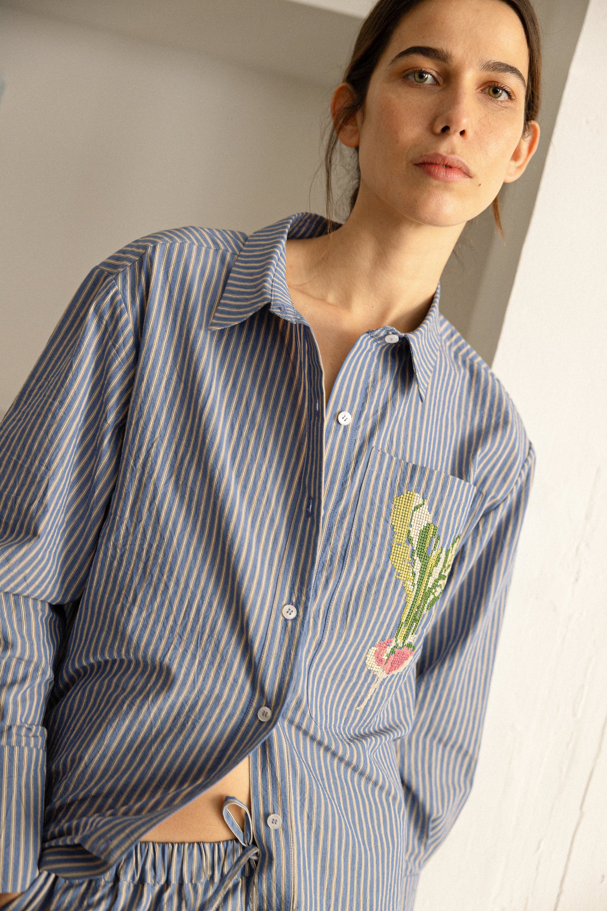 Vestido camisero Carlota a rayas azules y blancas y una flor bordada. Con él te sentirás estilosa y guapa, y ala vez ...