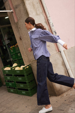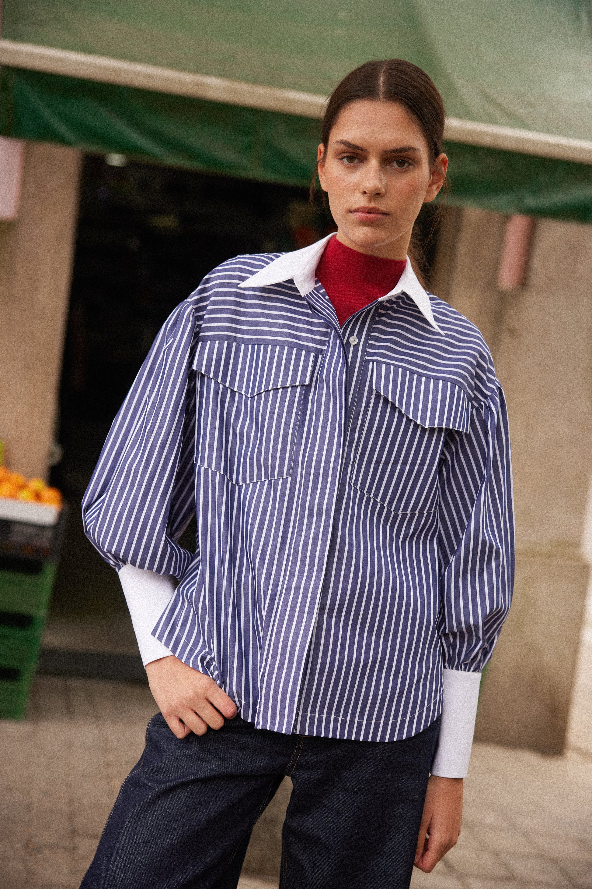Camisa a rayas azul y blanca confeccionada en 100% algodón. Destaca el cuello en pico y los puños en blanco y mangas abullonadas. Un clásico con un toque especial que no te podrás quitar.