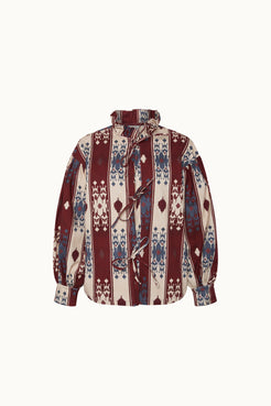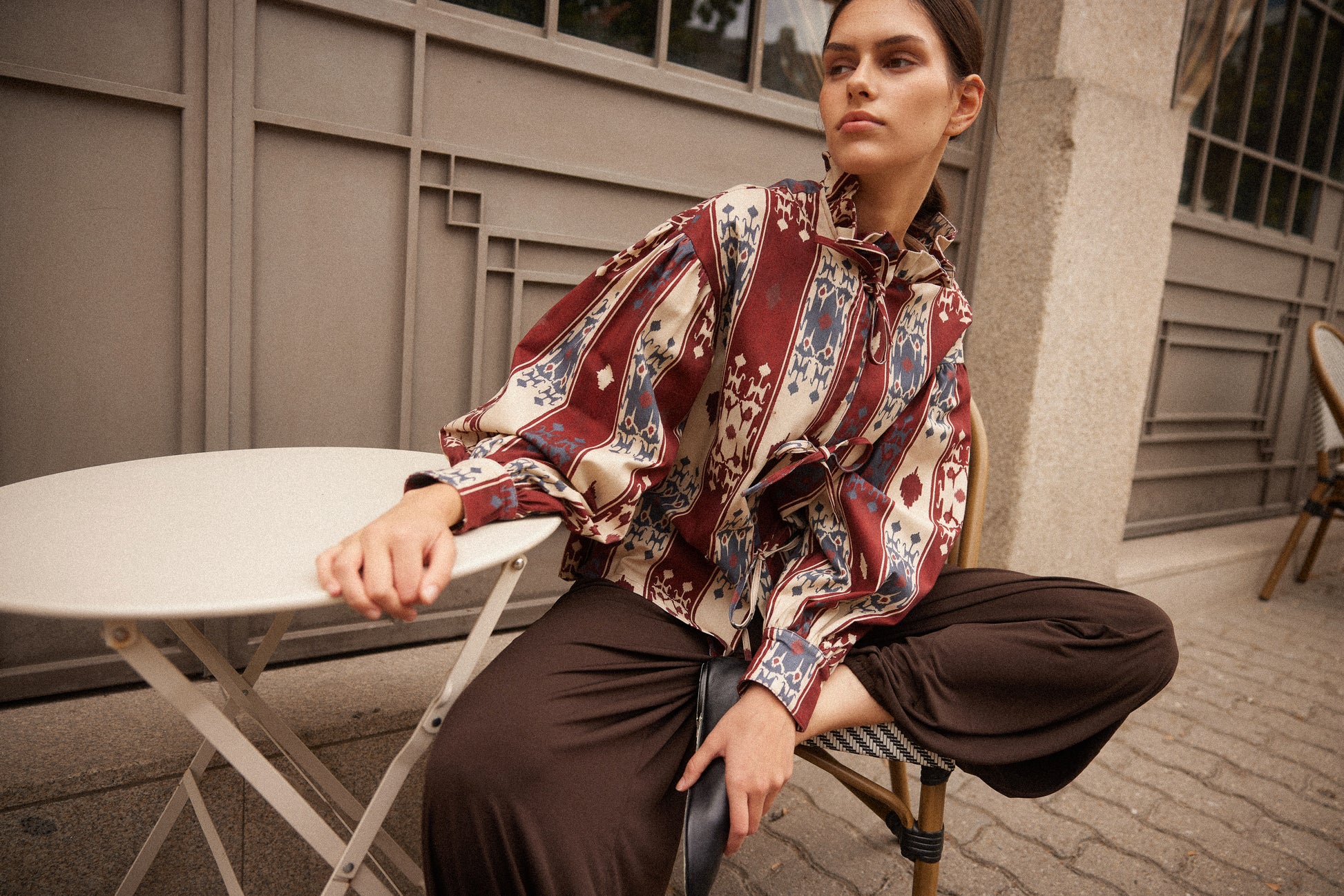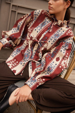 Sobrecamisa confeccionada en algodón con mangas abullonadas y terminadas en puño. Cierre con lazos en el delantero, que le aportan elegancia a la pieza. Una prenda perfecta para cualquier ocasión.