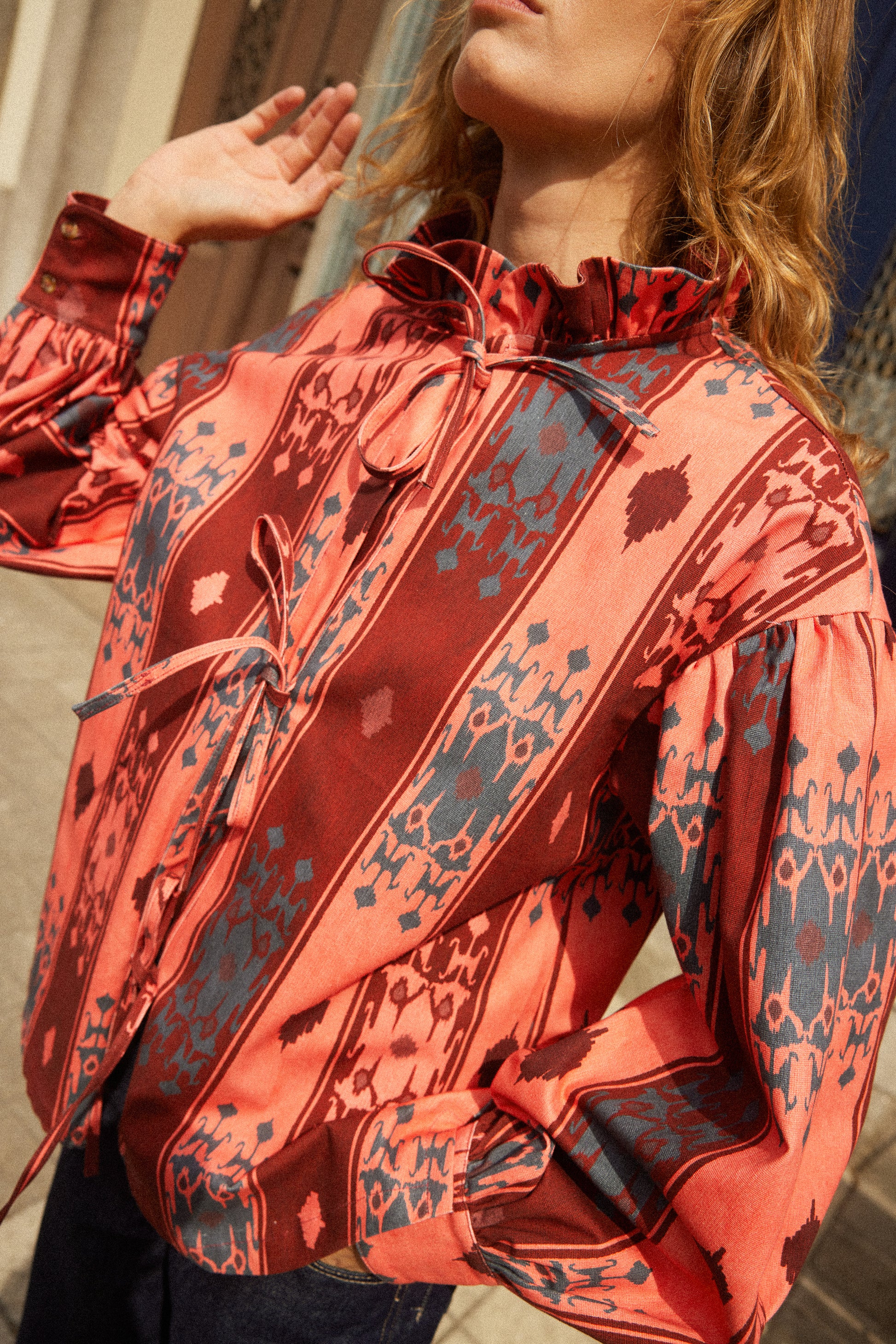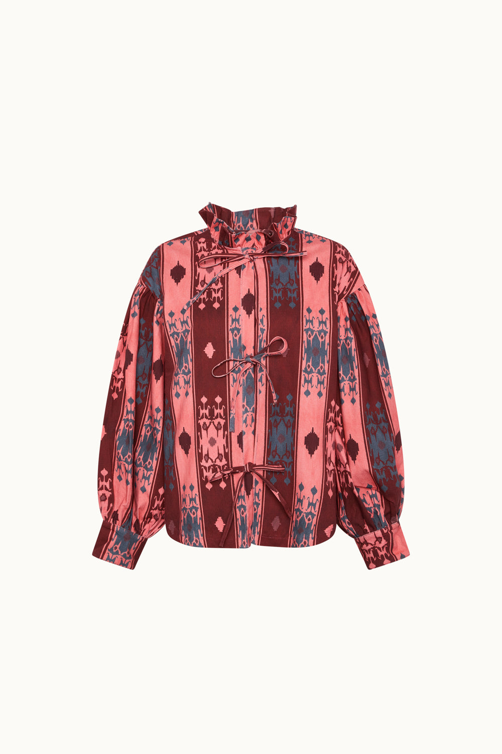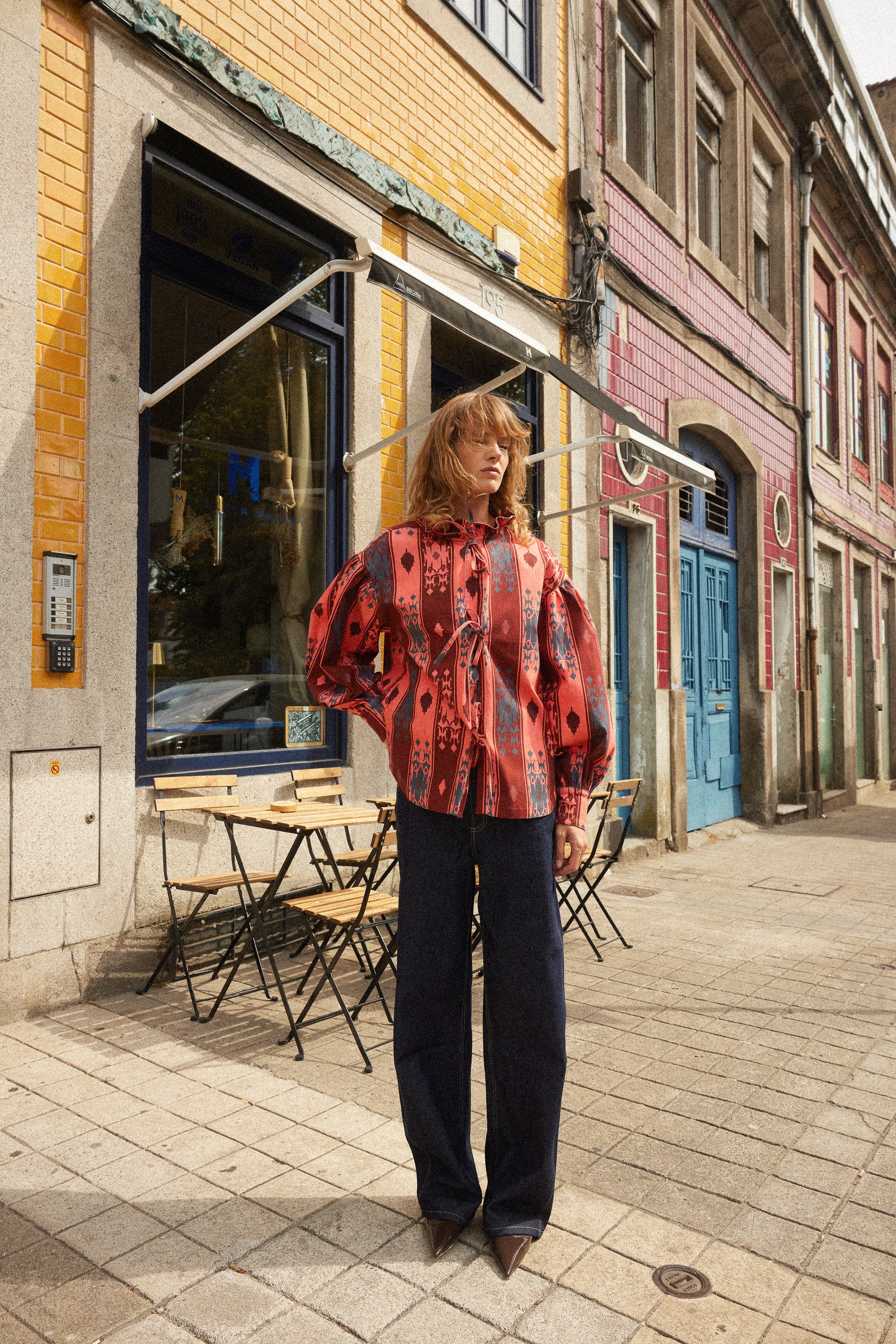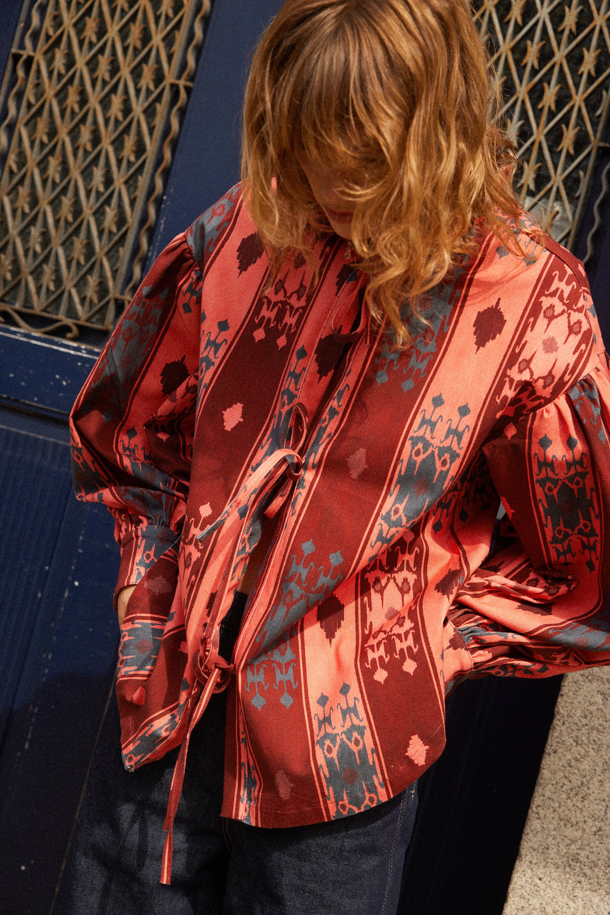 Sobrecamisa confeccionada en algodón con mangas abullonadas y terminadas en puño. Cierre con lazos en el delantero, que le aportan elegancia a la pieza. Una prenda perfecta para cualquier ocasión.