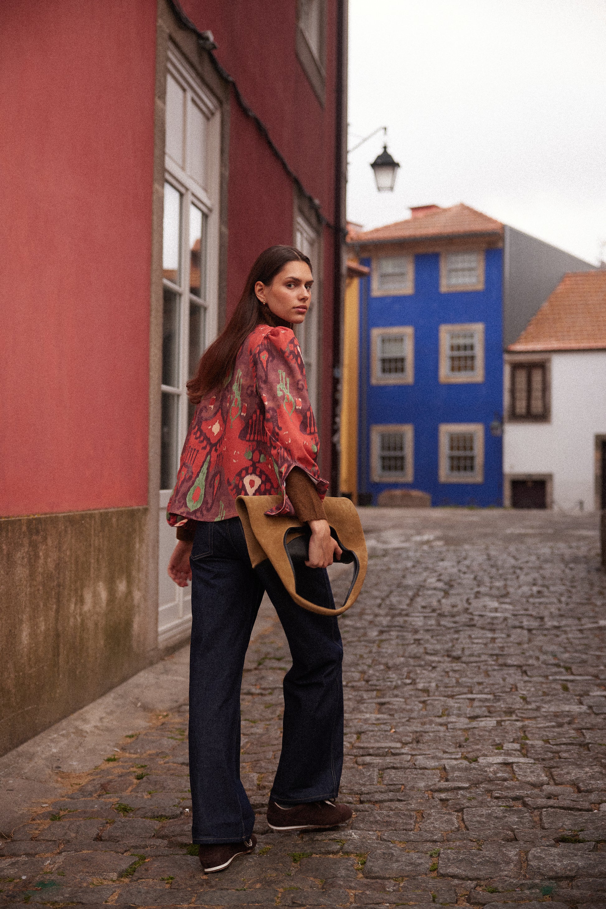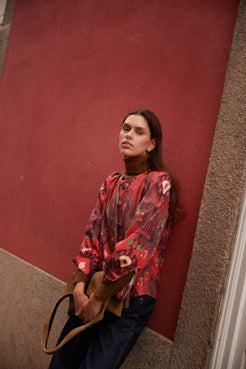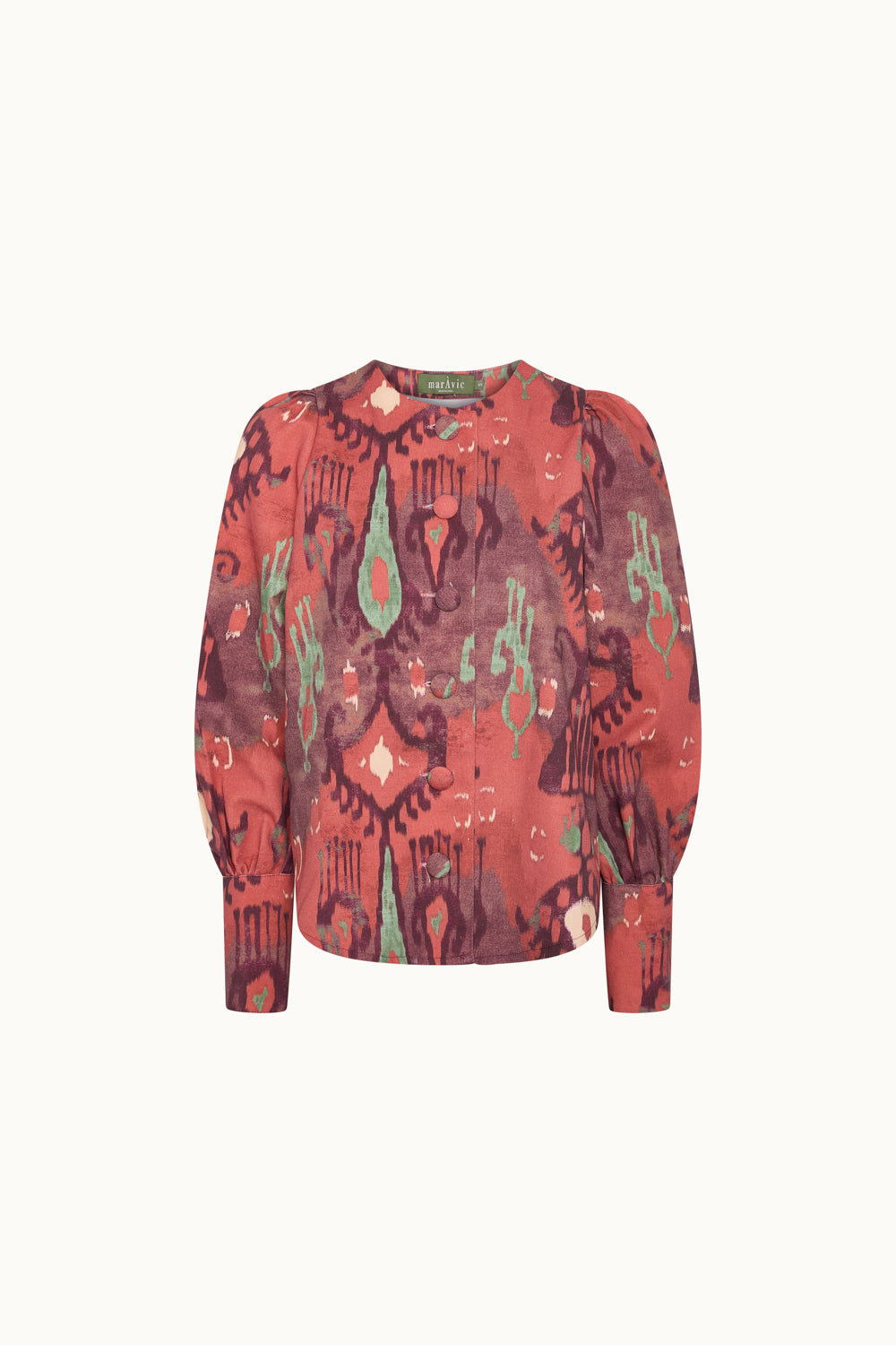 Sobrecamisa con un estampado étnico en tonos rojos confeccionada en 100% algodón. Mangas abullonadas y acabadas en puño. Botones forrados en el mismo tejido aportándole un toque elegante y especial a la prenda.