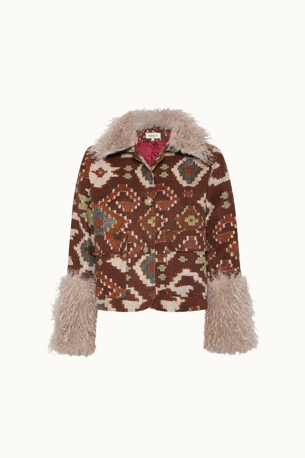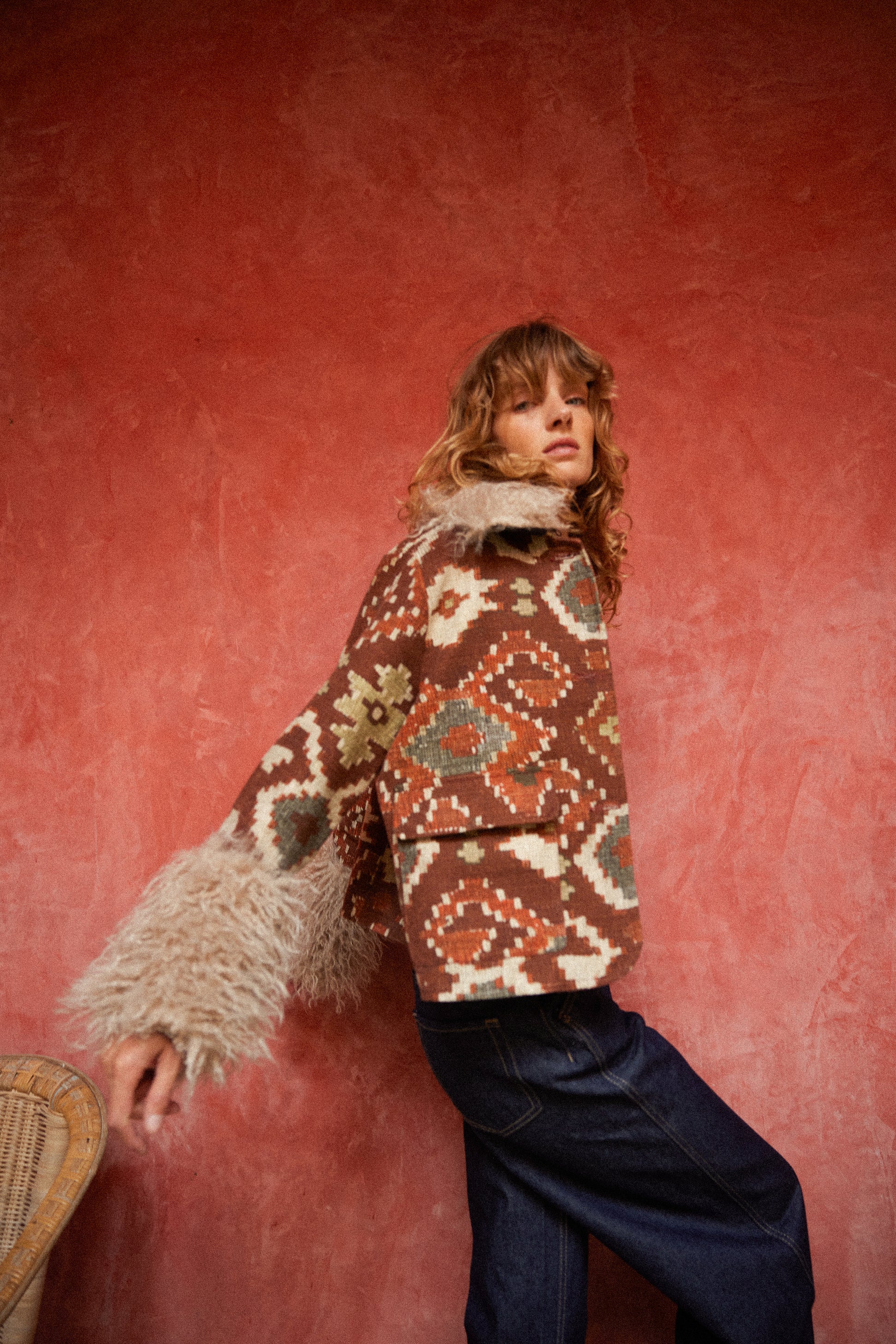Chaqueta estampado étnico en tonos marrones confeccionada en 100% algodón. Forro interior. Destaca por sus botones forrados y bolsillos a los lados. Pelo sintético en mangas y cuello extraíble. Una pieza única y versátil que añade un toque especial y sofisticado a tu armario. Ideal para crear looks modernos y elegantes.