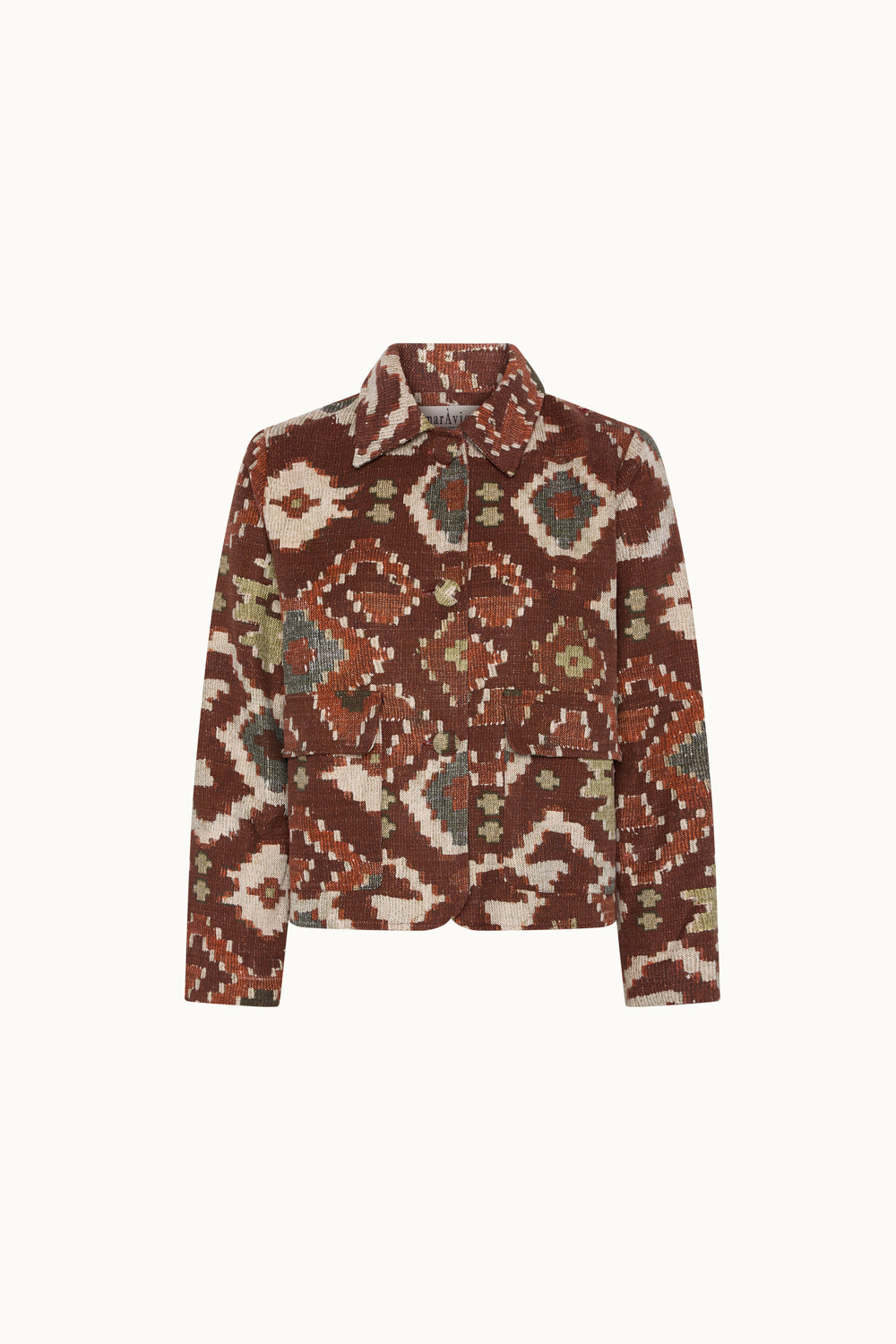 Chaqueta estampado étnico en tonos marrones confeccionada en 100% algodón. Forro interior. Destaca por sus botones fo...