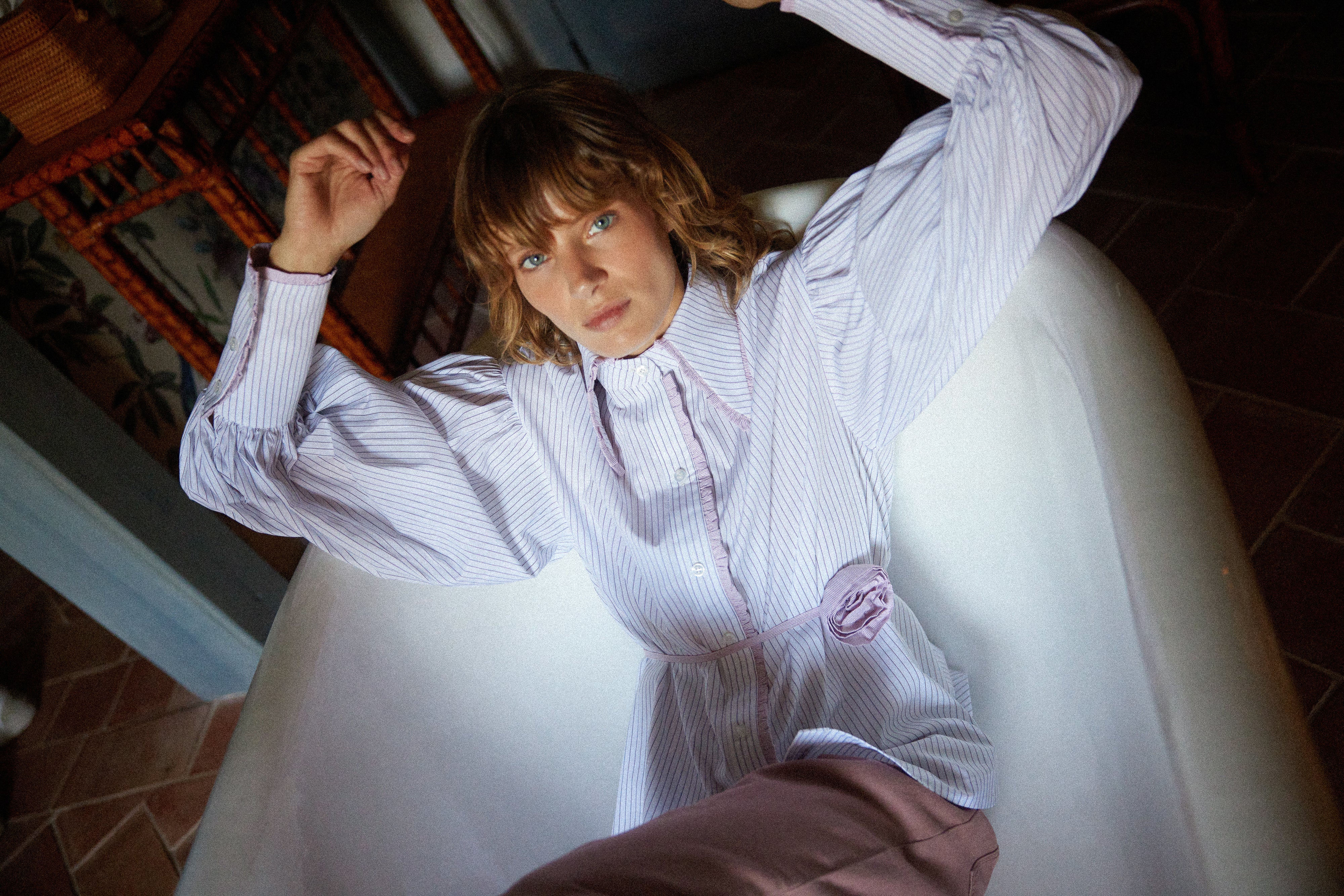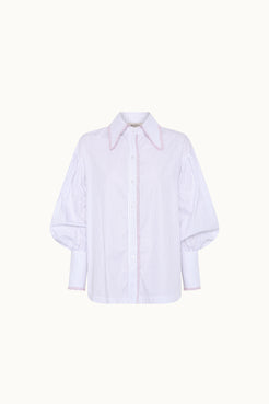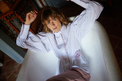 Camisa a rayas rosa y blanca. Cuello y cruce adornado con volante en rosa. Mangas abullonadas terminadas en puño. Cue...