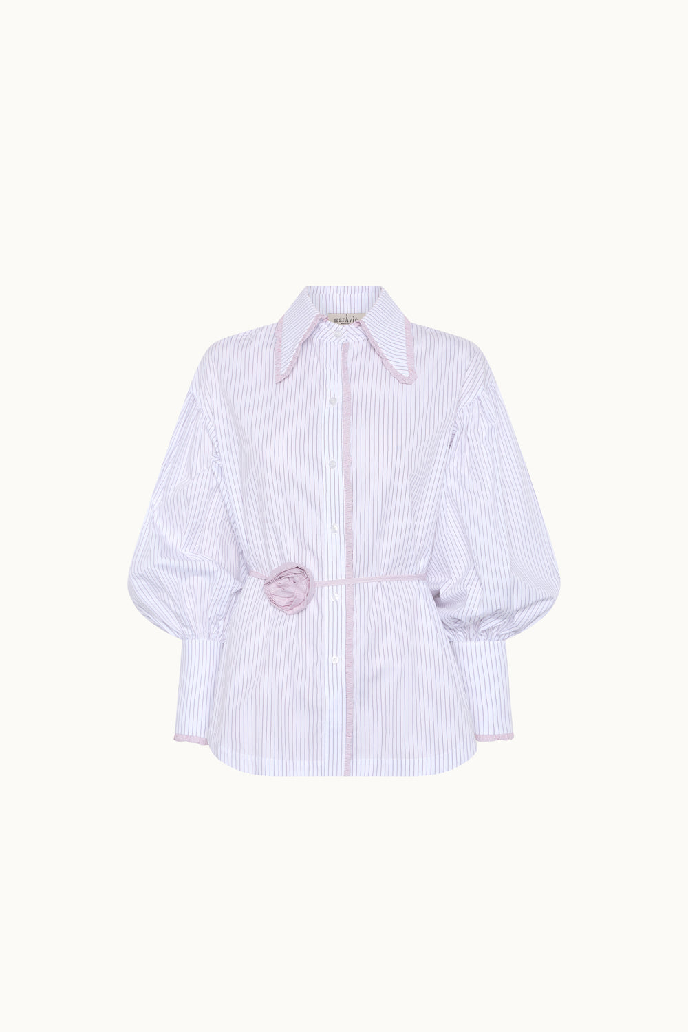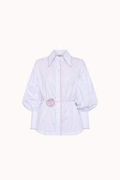Camisa a rayas rosa y blanca. Cuello y cruce adornado con volante en rosa. Mangas abullonadas terminadas en puño. Cuello adornado con una flor de accesorio. Confeccionada en 100% algodón.
