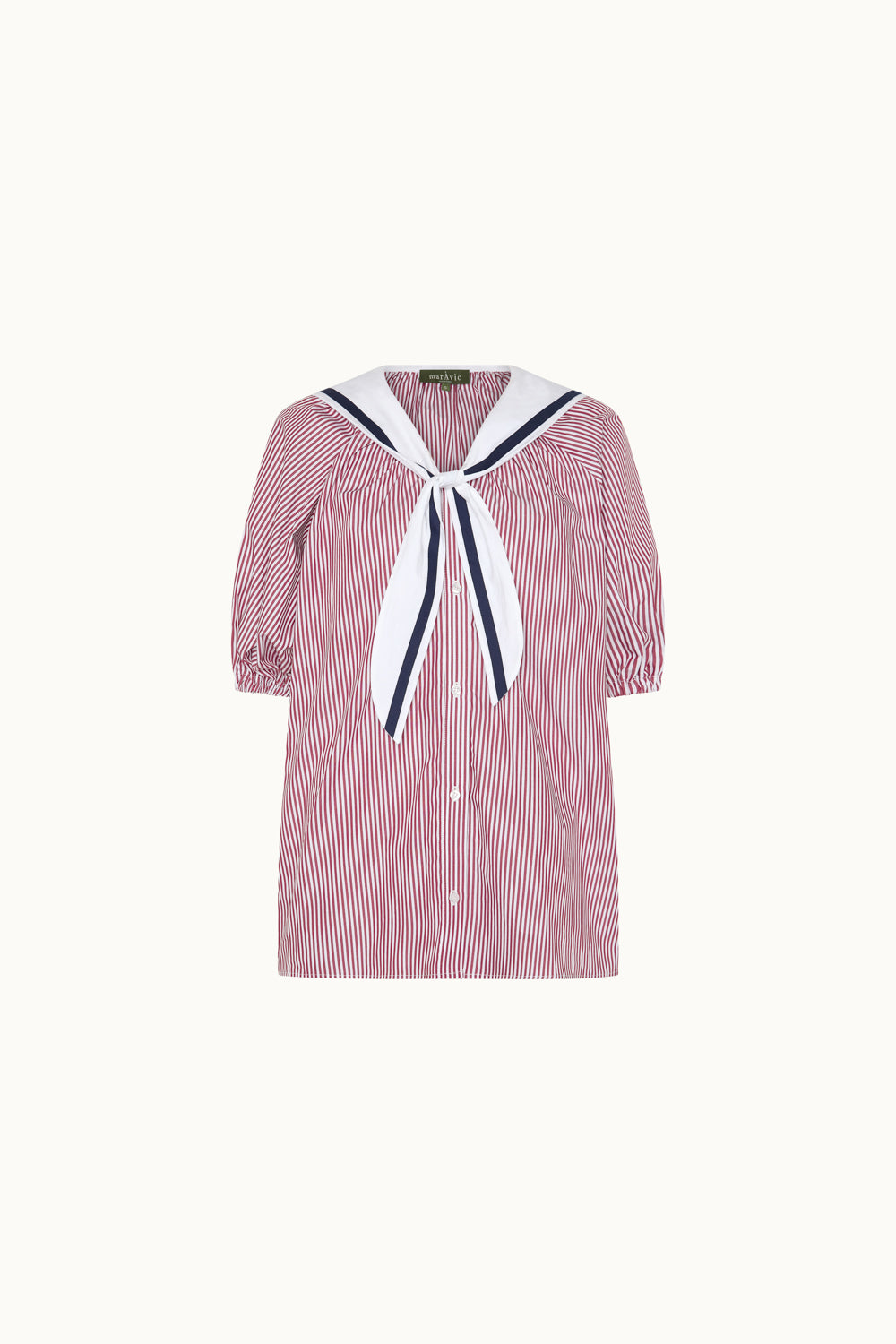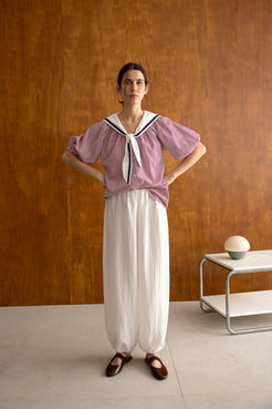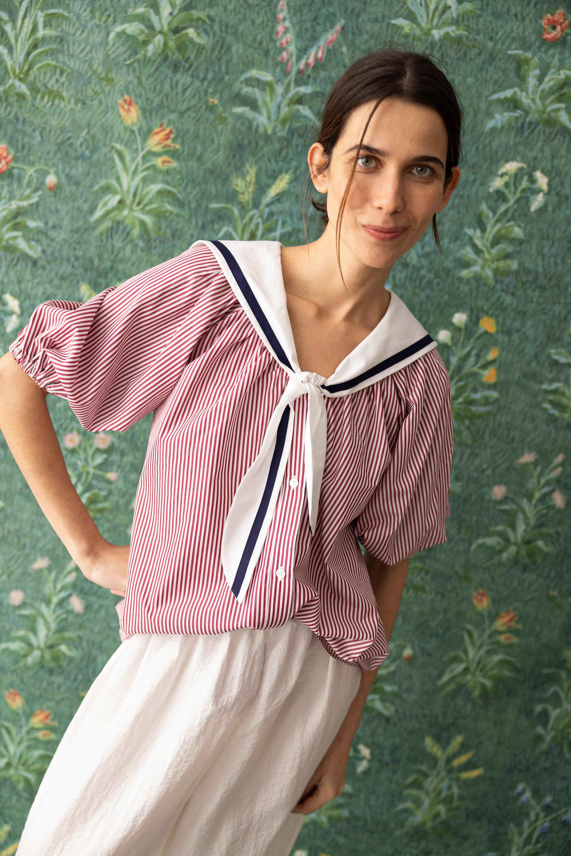 Camisa de rayas con cuello marinero y lazo decorativo. Su corte amplio y su tejido ligero la convierten en una prenda perfecta para un estilo clásico y relajado.