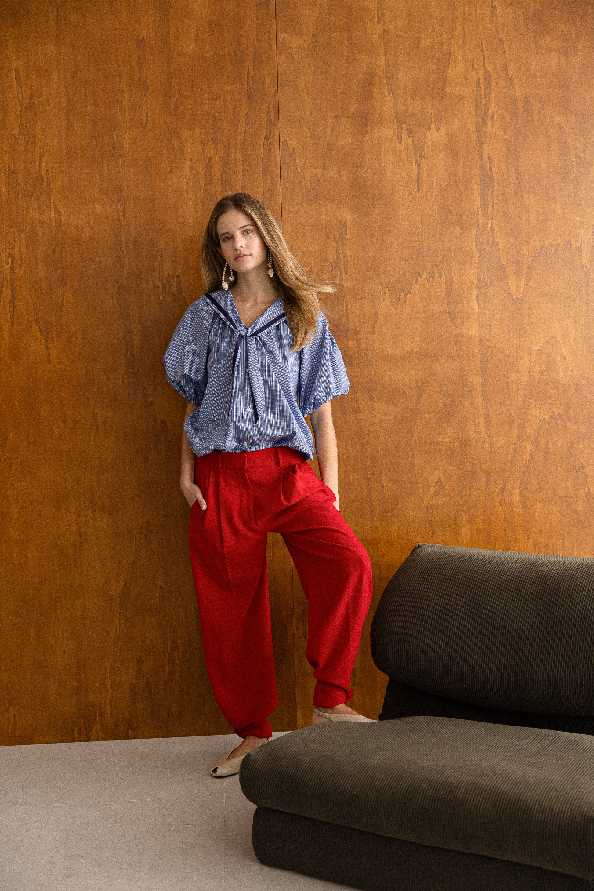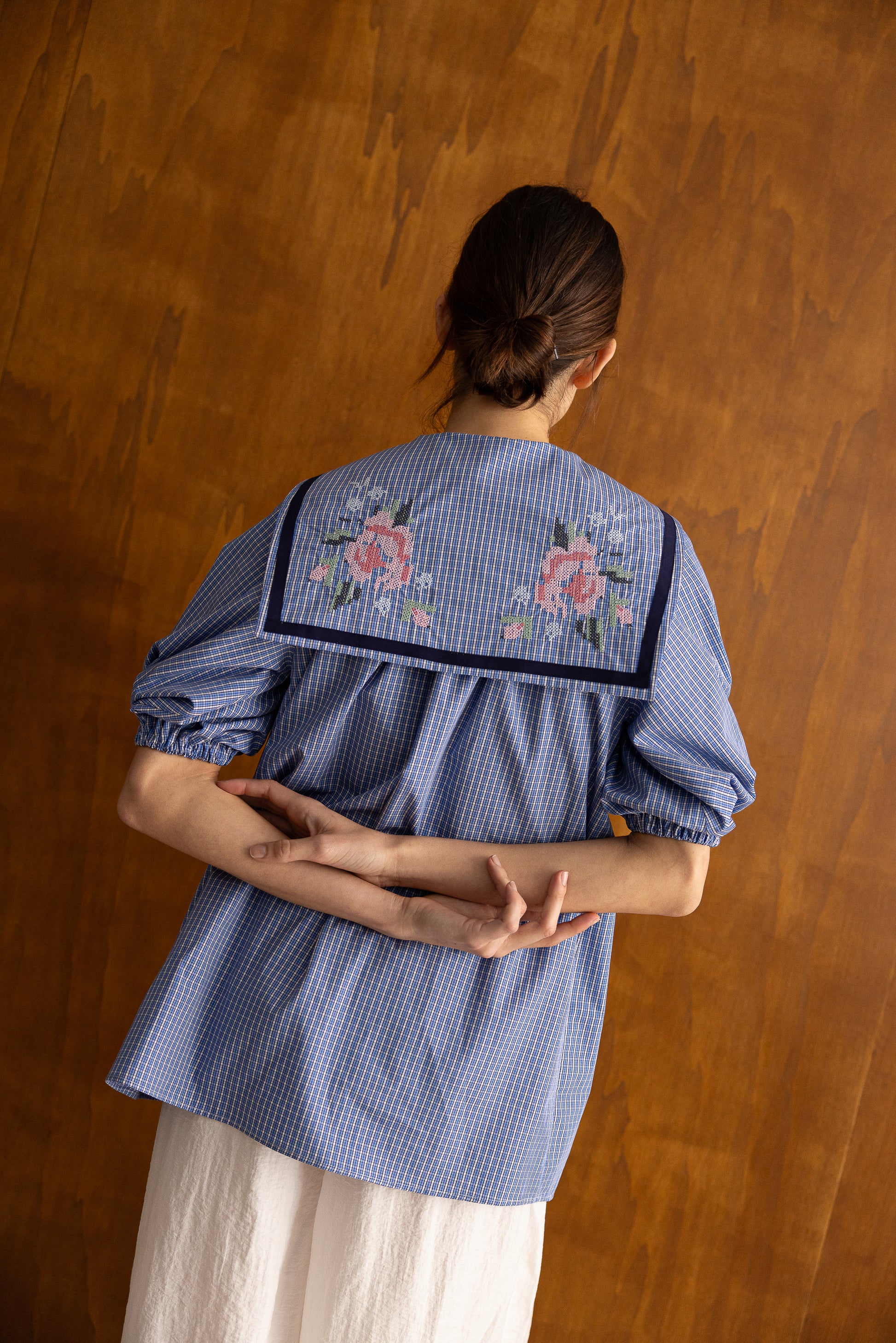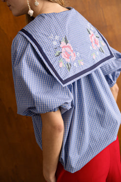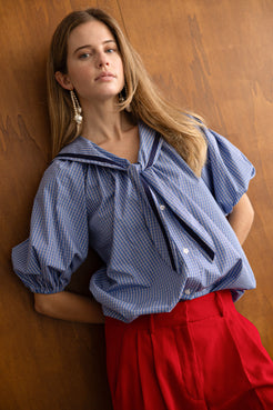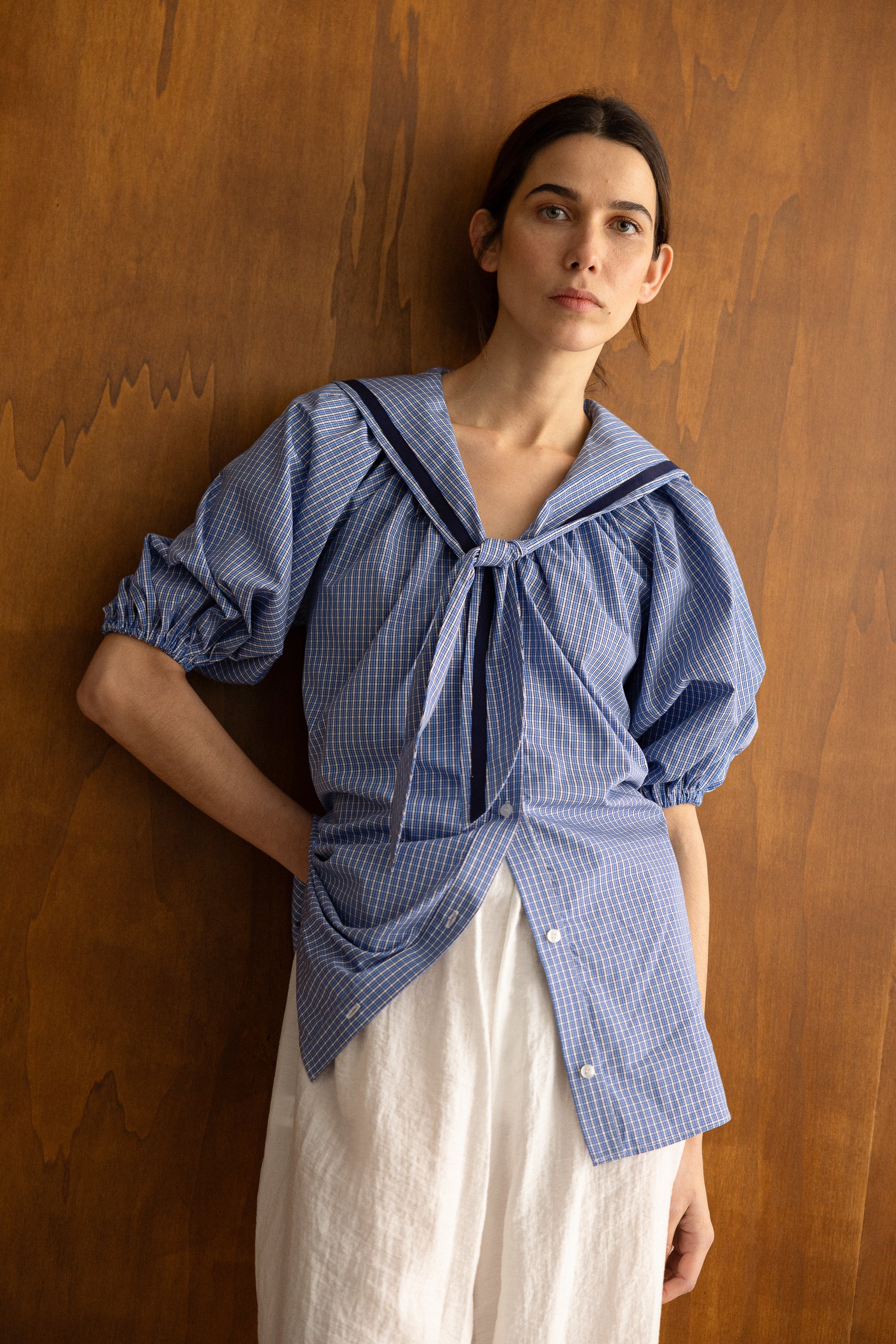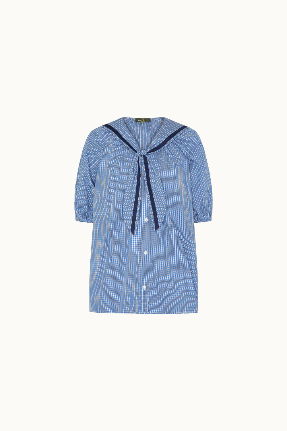 Camisa a cuadros azul con cuello marinero y lazo decorativo. Su corte amplio y su tejido ligero la convierten en una prenda perfecta para un estilo clásico y relajado.