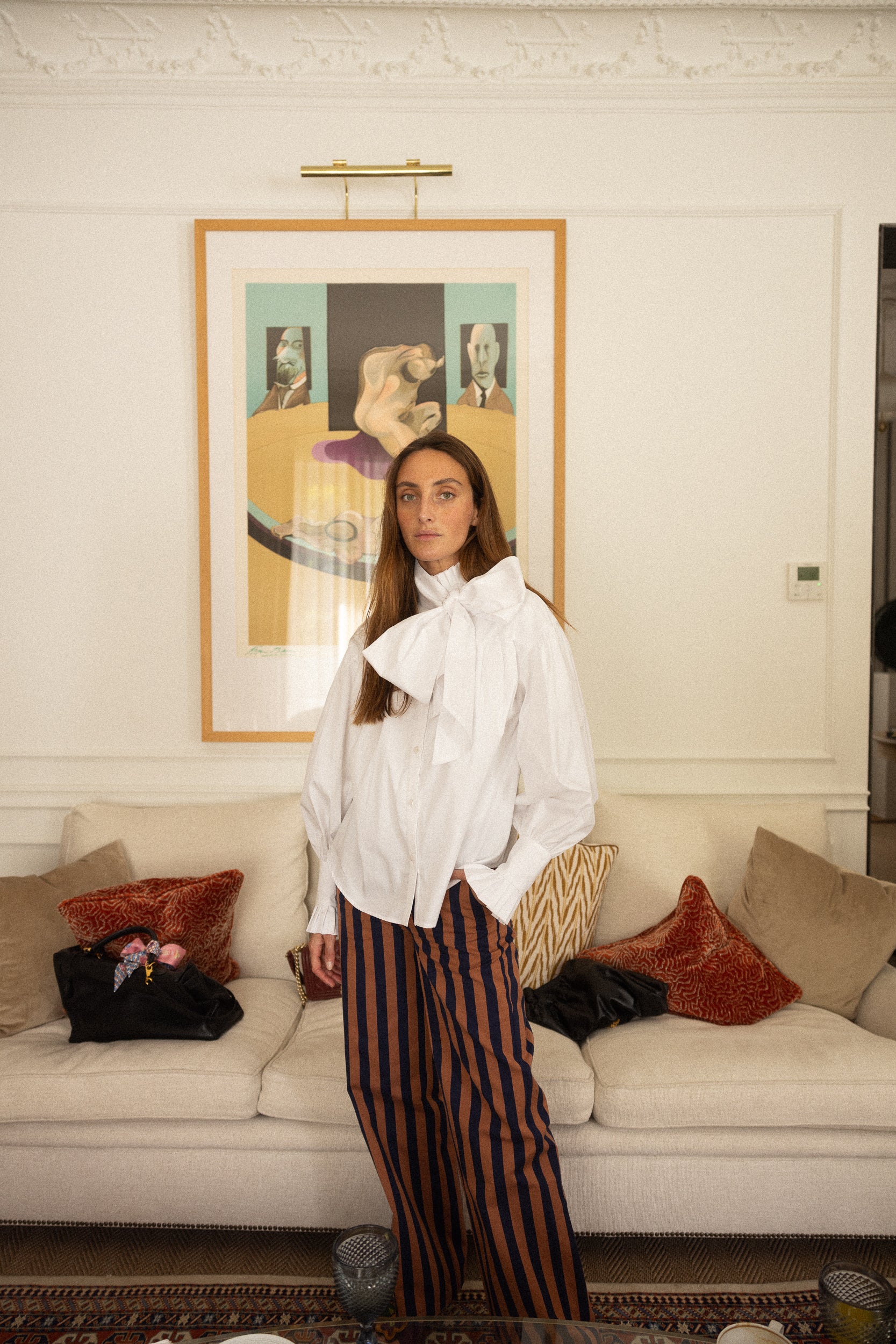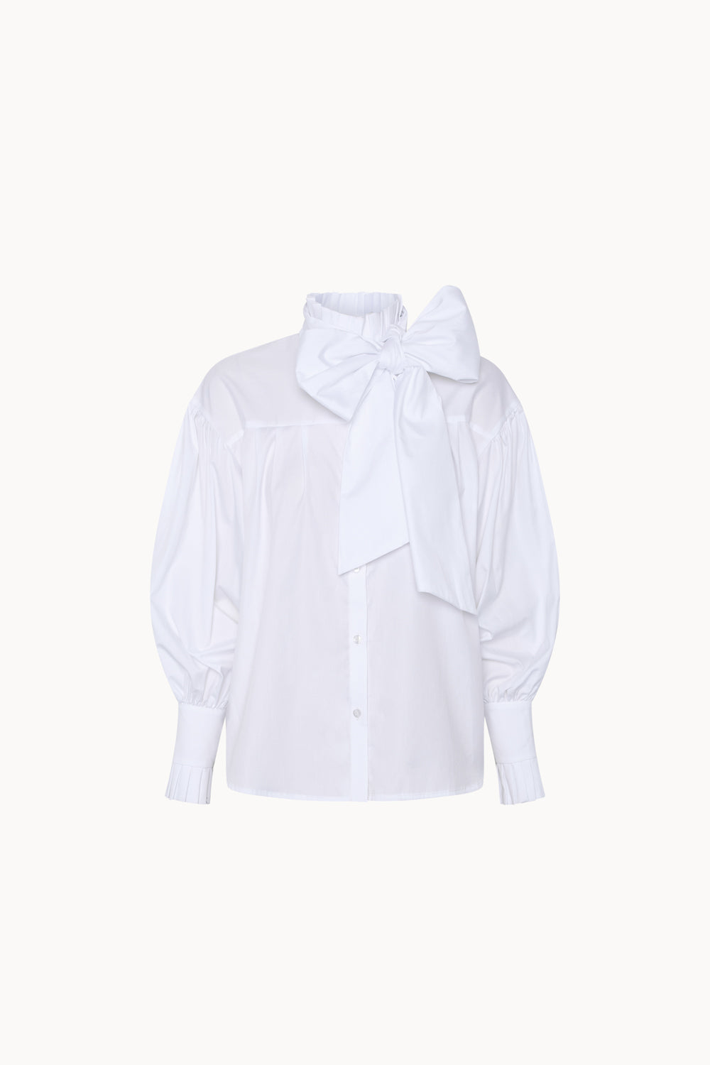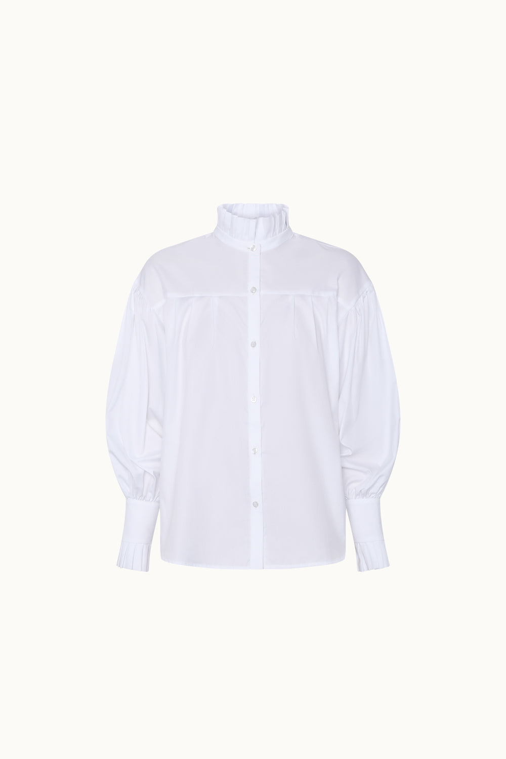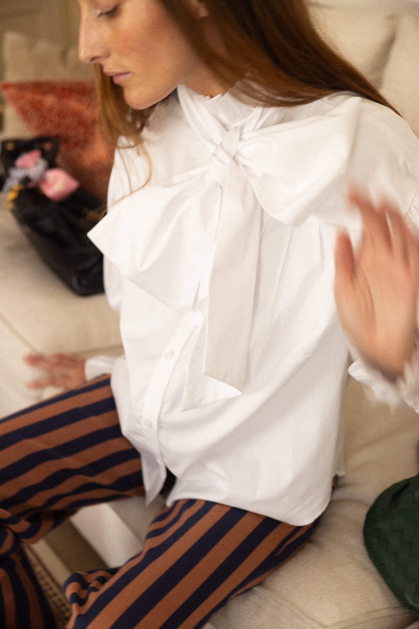Camisa blanca confeccionada en un tejido 100% algodón. Cuello con volante y lazo, mangas abullonadas y puños con volantes.
