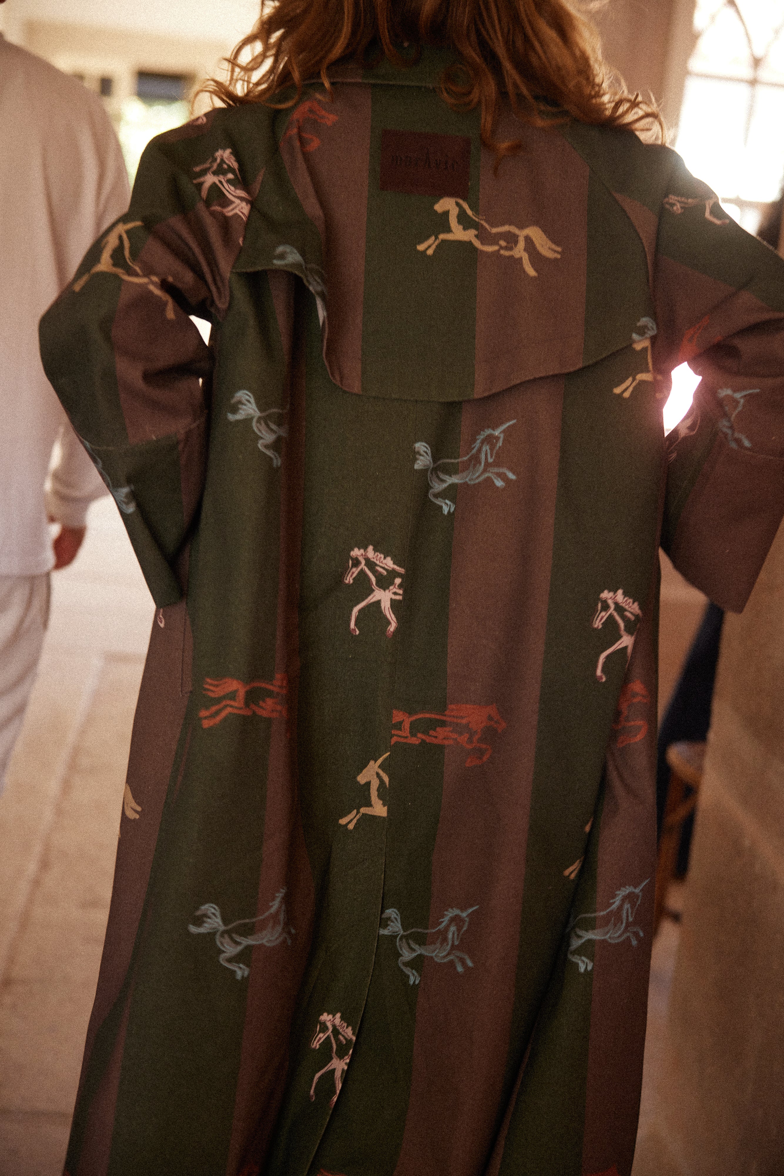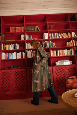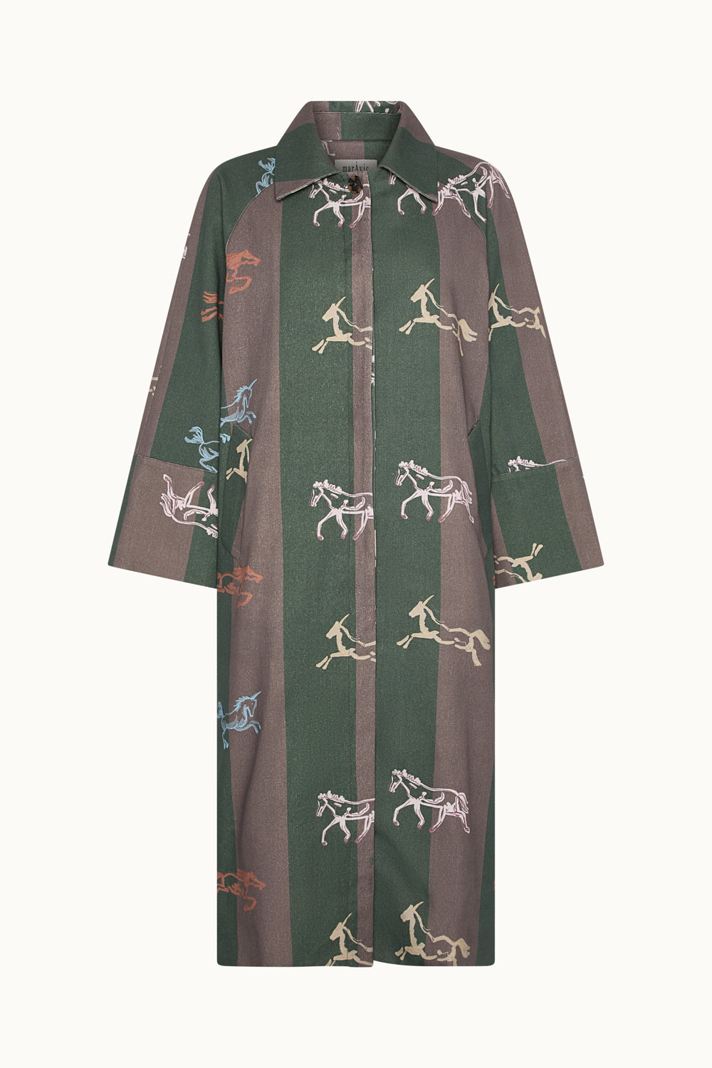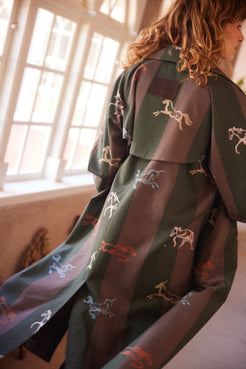 Gabardina a rayas verde y marrón con caballos. Confeccionada en un tejido 100% algodón. Cierre frontal con botones oc...
