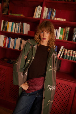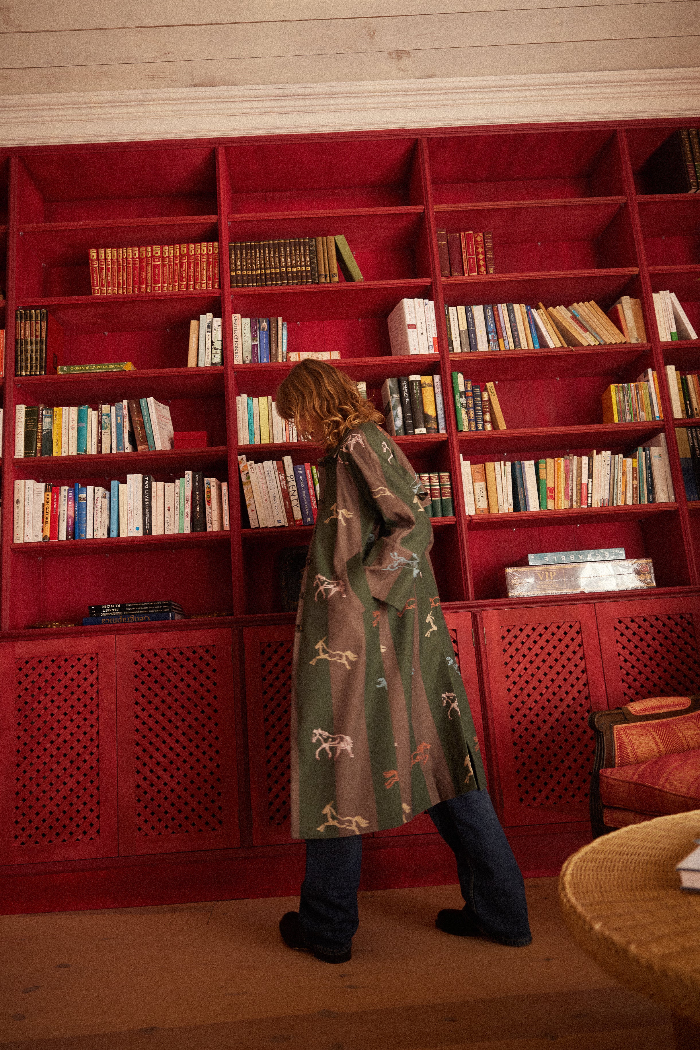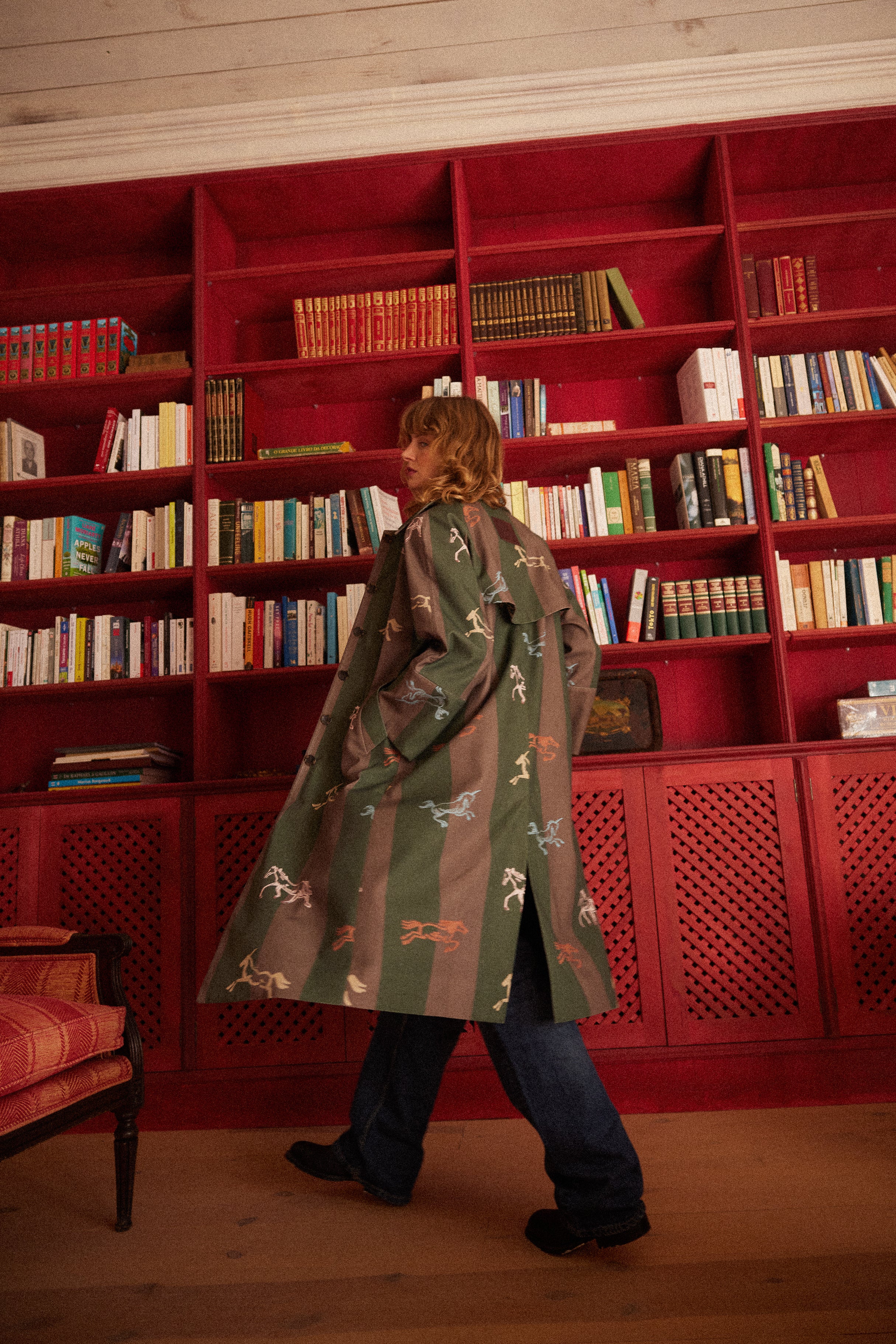 Gabardina a rayas verde y marrón con caballos. Confeccionada en un tejido 100% algodón. Cierre frontal con botones ocultos y dos bolsillos con solapa en el delantero. Parche de piel a la espalda. Forro de algodón.