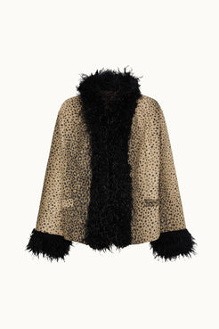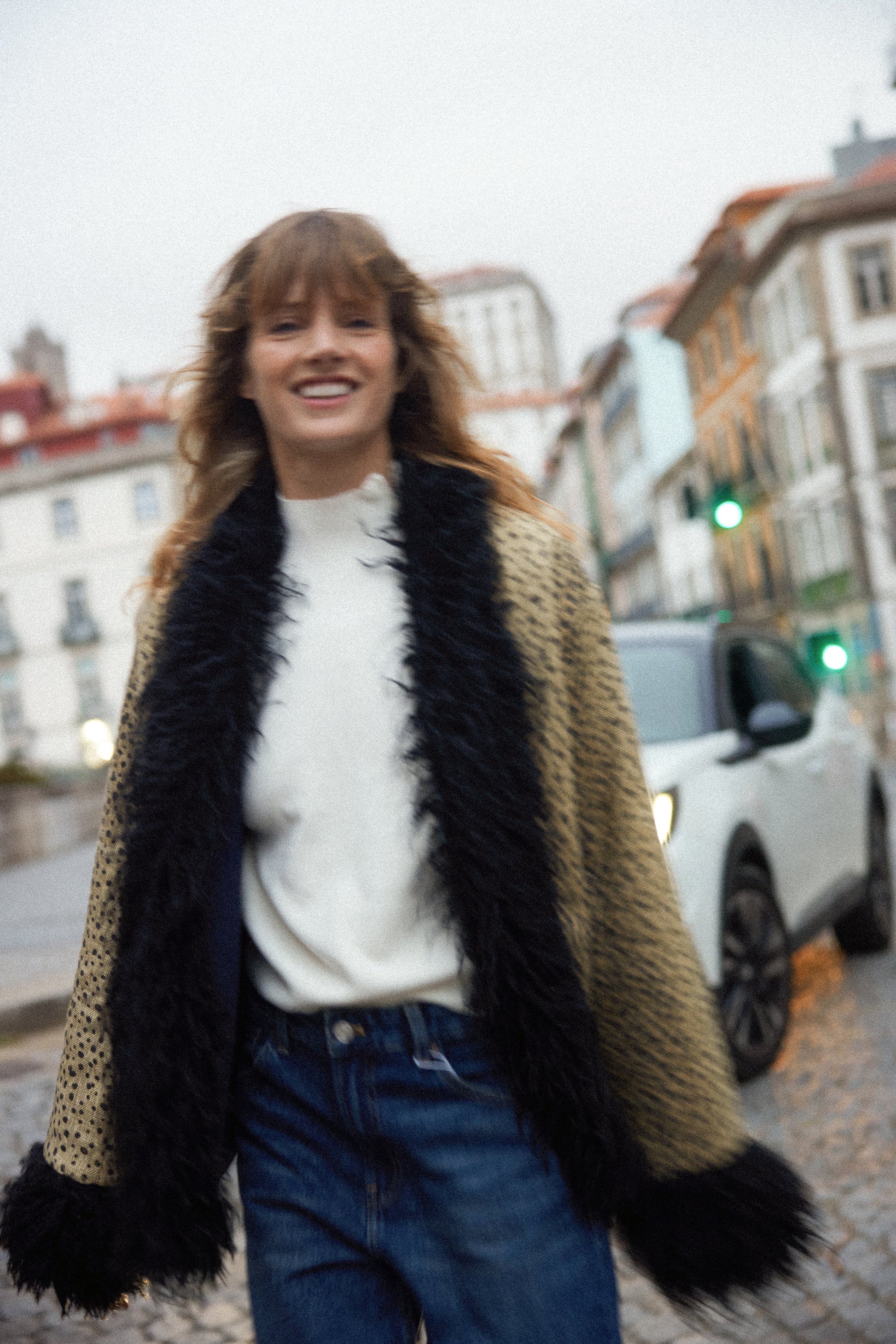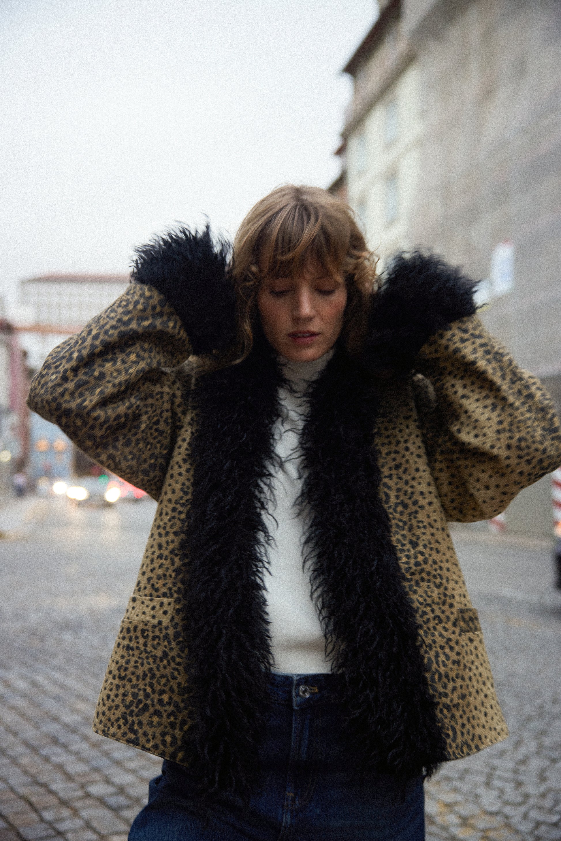 Chaqueta con un estampado de animal print confeccionada en algodón y lino. Pelo sintético en puños, cuello y cruce. B...