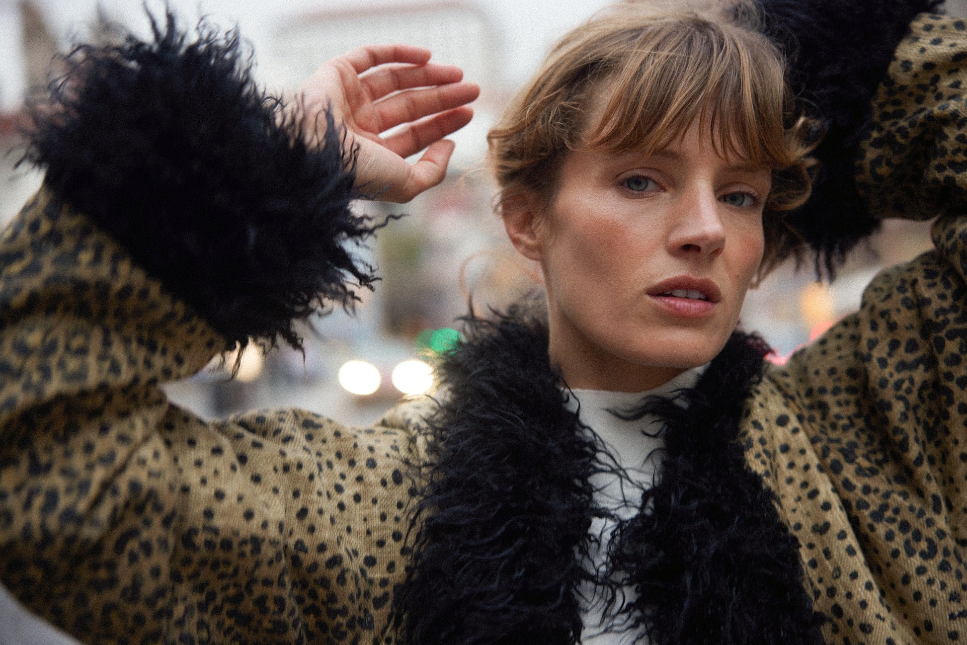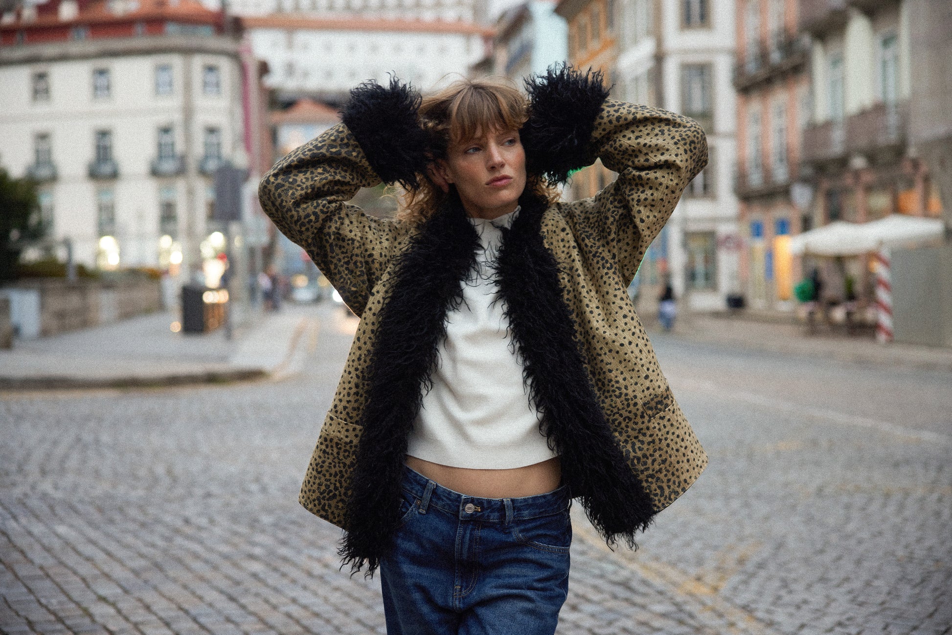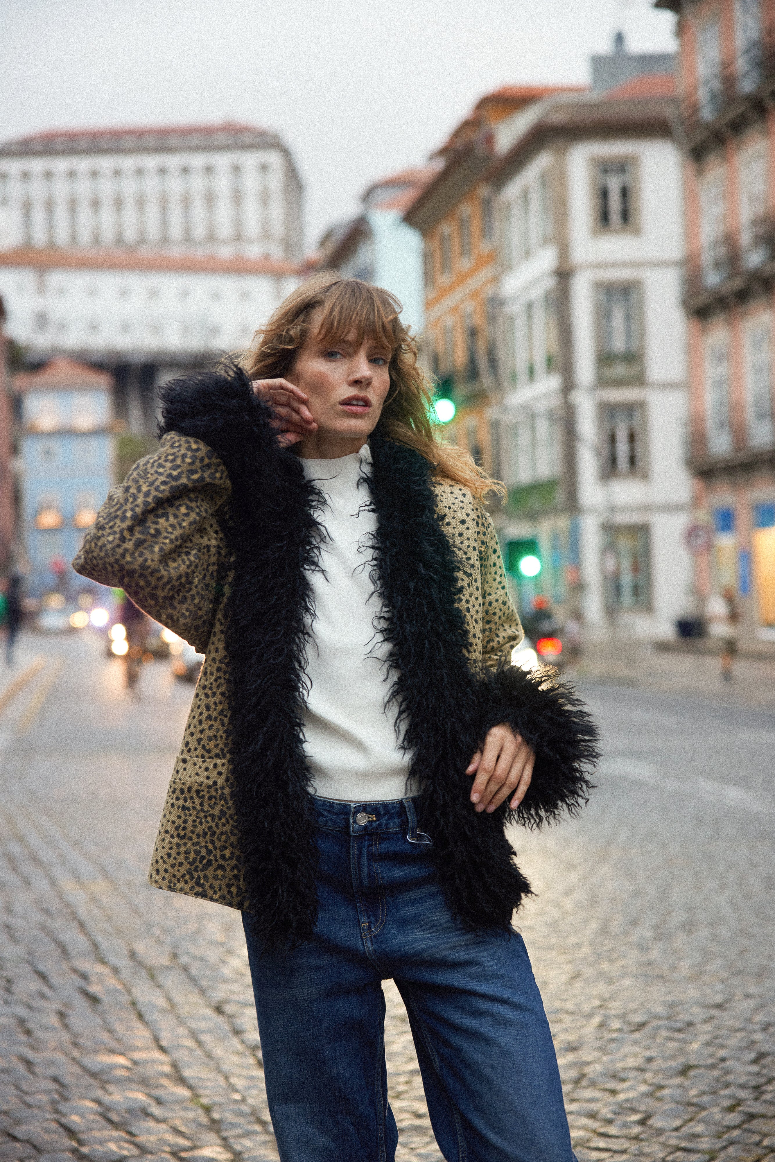 Chaqueta con un estampado de animal print confeccionada en algodón y lino. Pelo sintético en puños, cuello y cruce. Bolsillos en el delantero y forro acolchado.