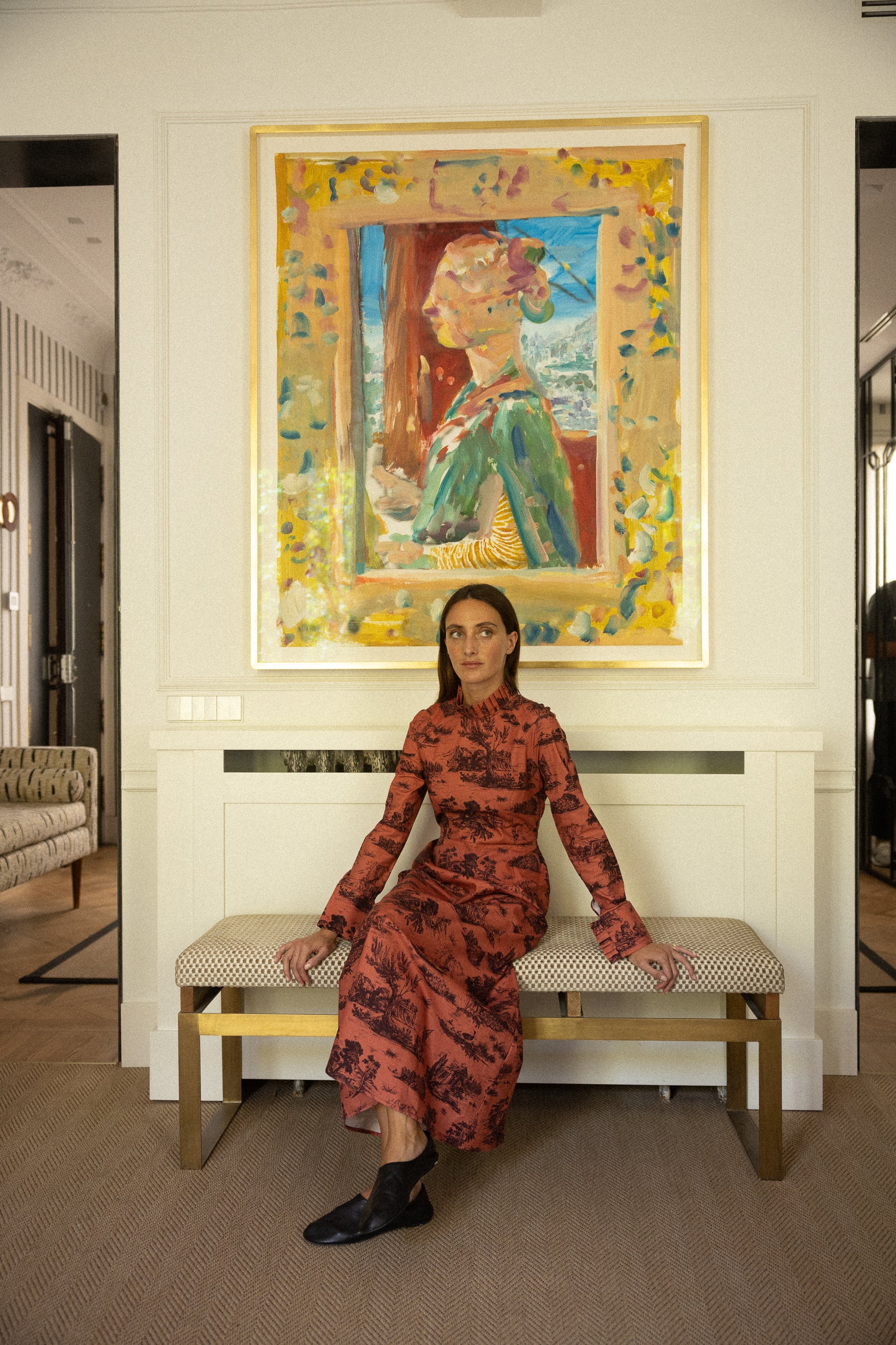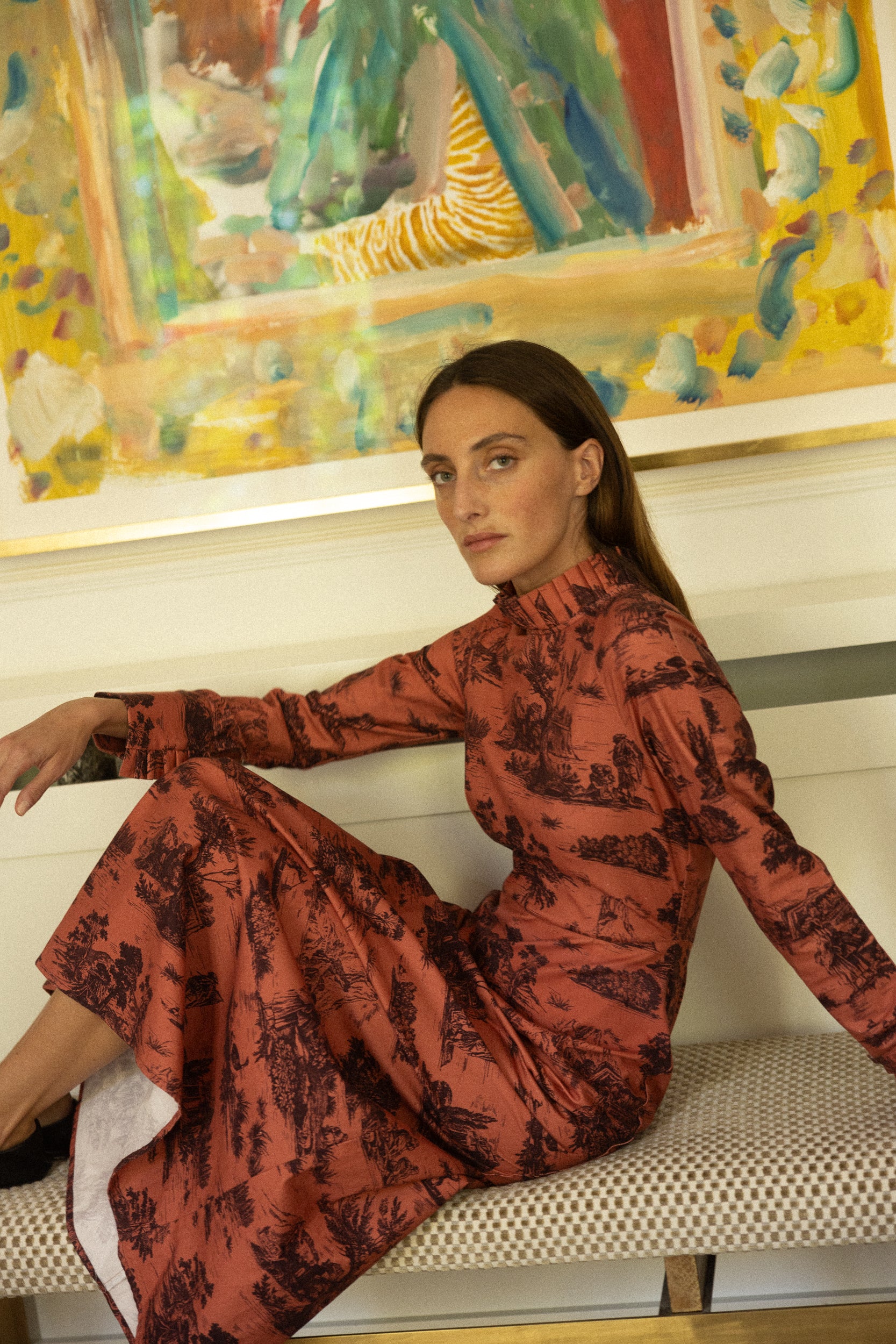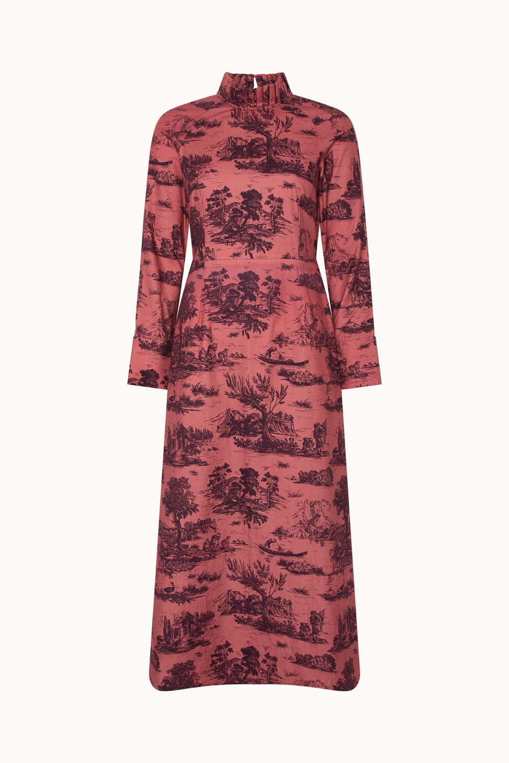 Vestido en un estampado toile de jouy en tonos rojos. Cuello con volante y manga ajustada. Confeccionada en 100% algodón.