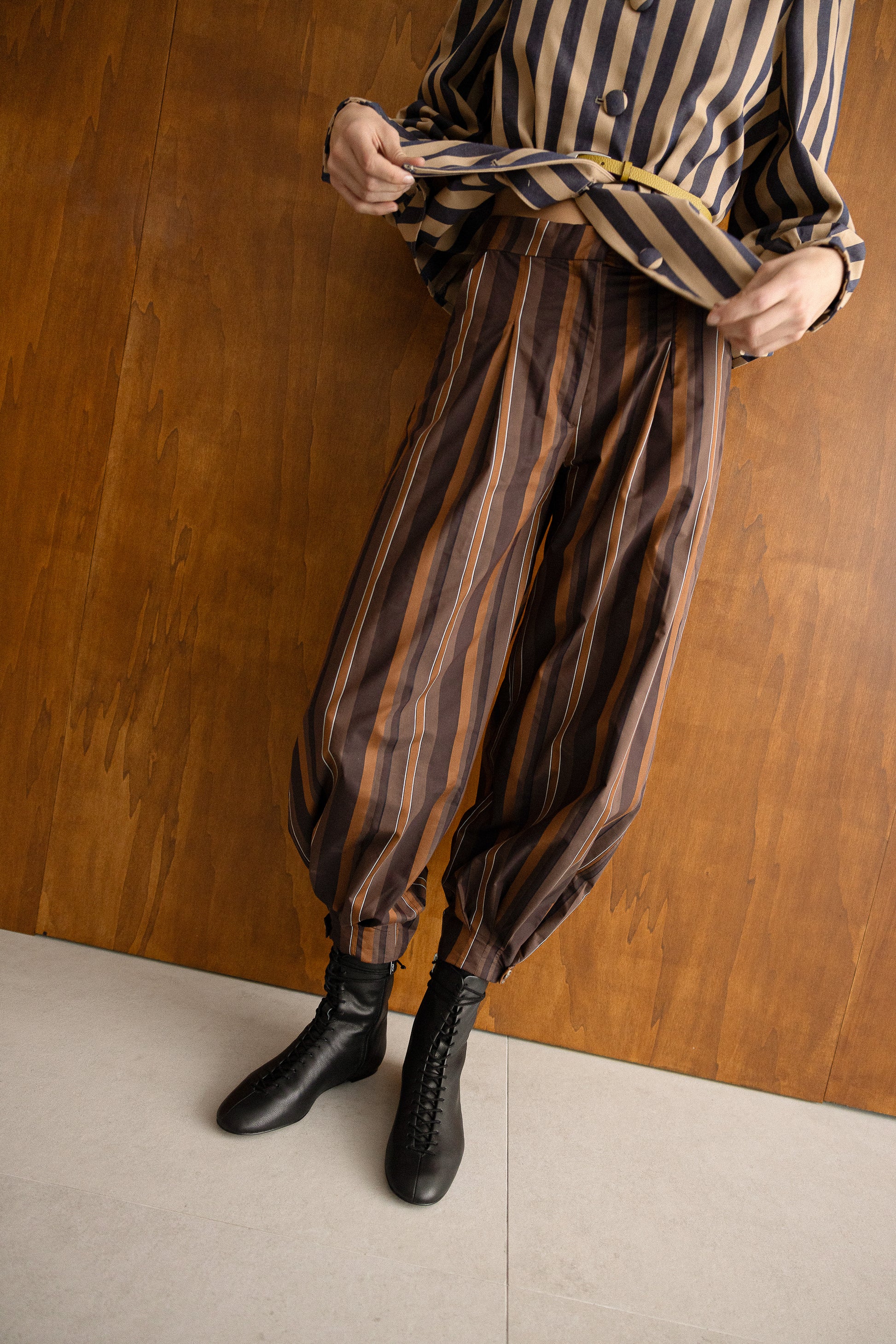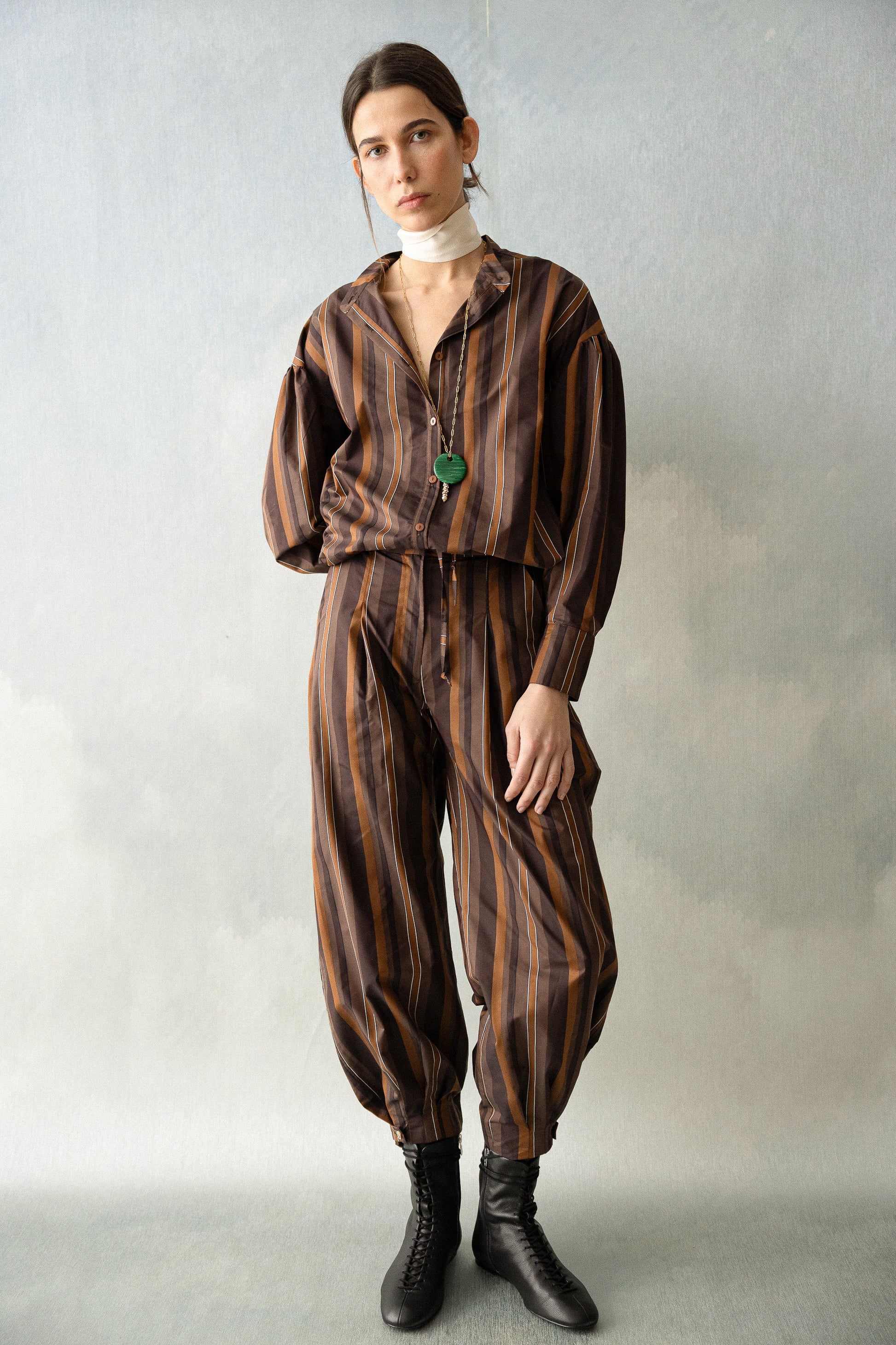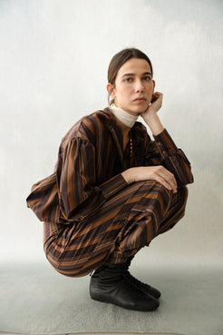Los Malva Pants son un pantalón bombacho que convierte el estampado en protagonista. Sus rayas en tonos marrones aportan carácter y calidez a una silueta holgada y cómoda, pensada para moverse con libertad sin perder un ápice de estilo. Combinan a la perfección con la Malva Shirt, o se llevan solos como pieza central de cualquier conjunto.