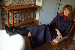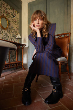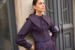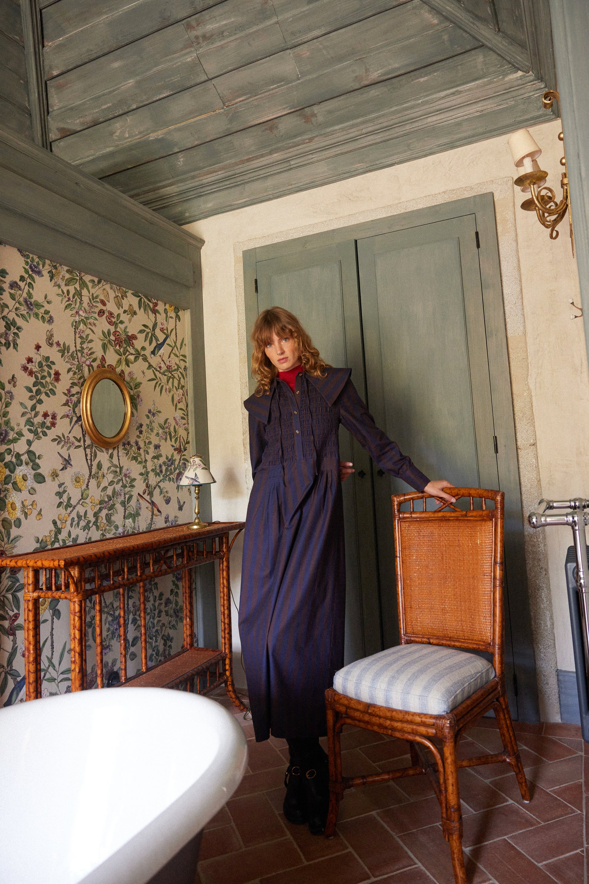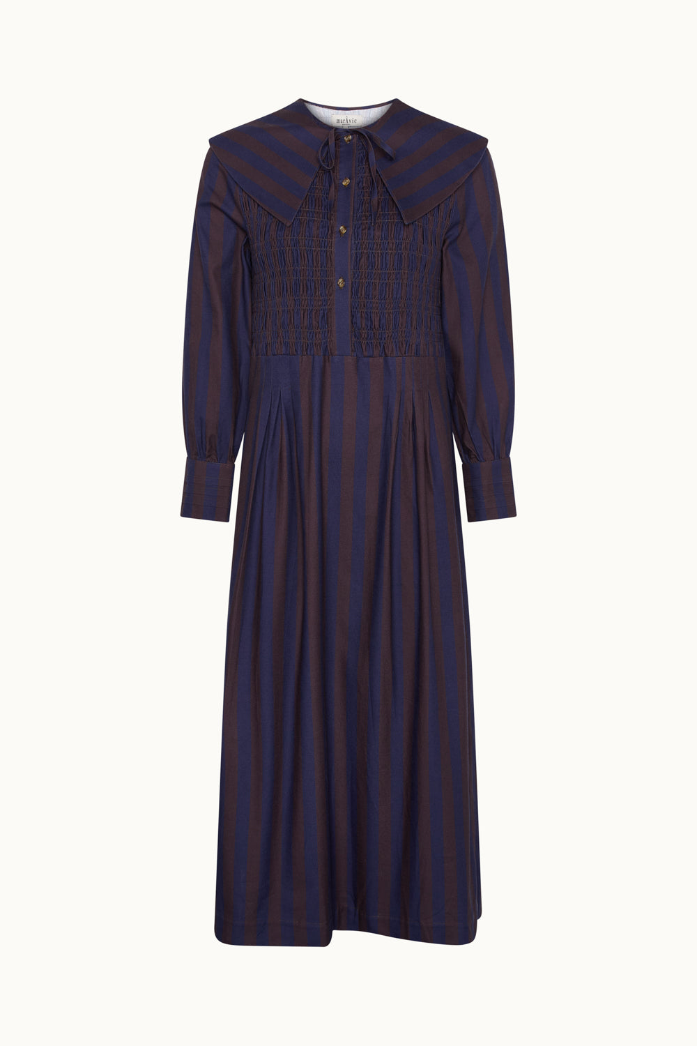 Vestido a rayas azul y marrón, con cuello babero y pecho con nido de abeja. Corte en la cintura y parte superior cerrada con botones. Puños con detalles cerrados con botones.