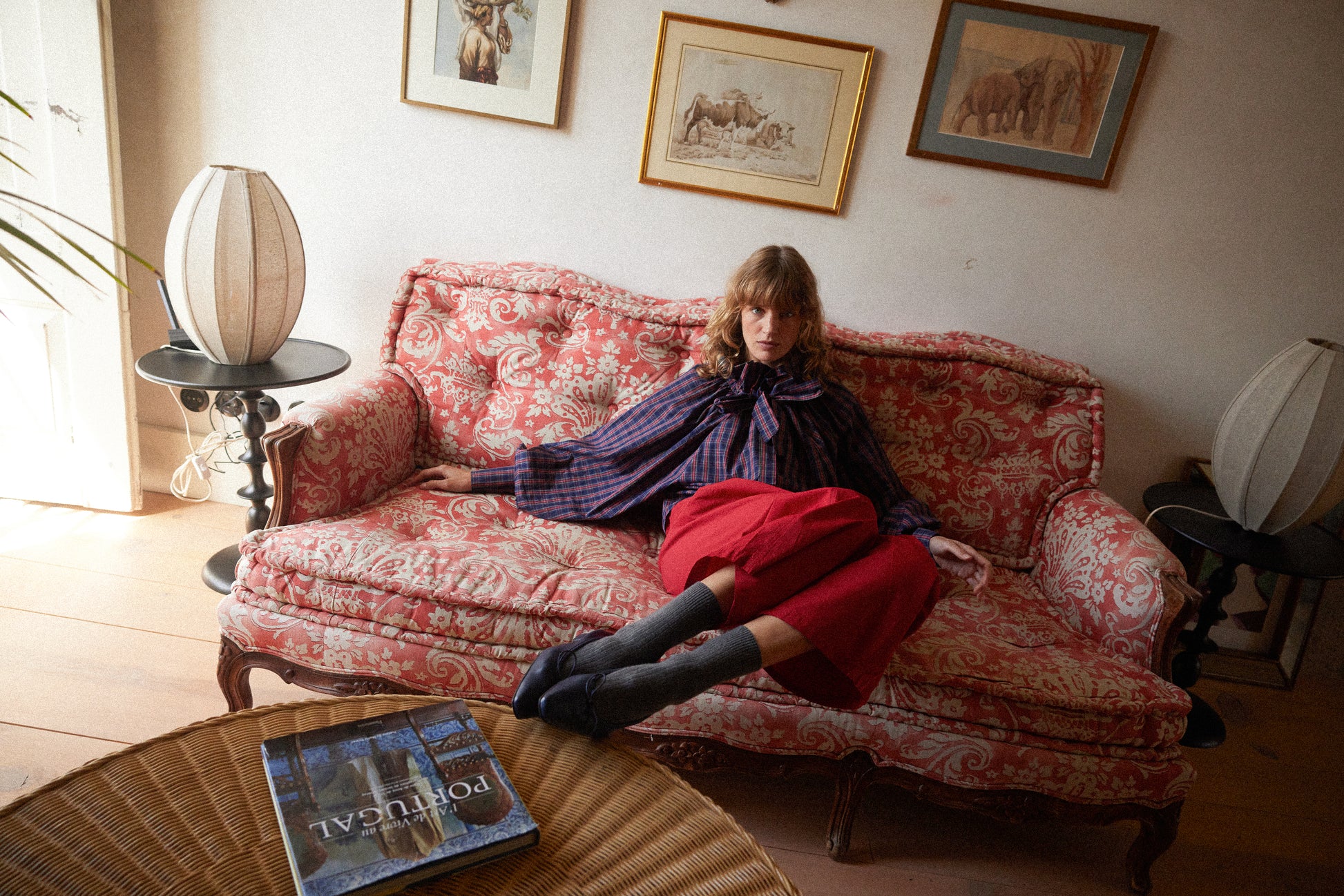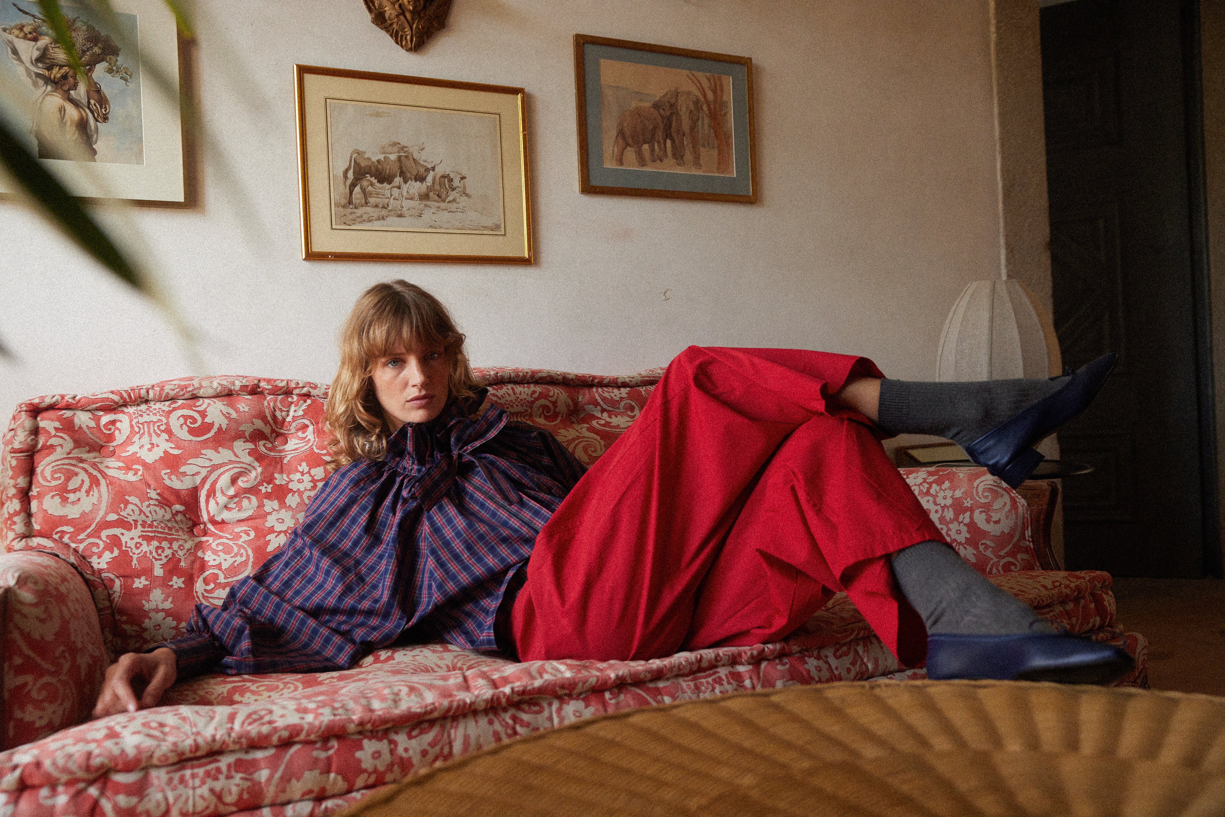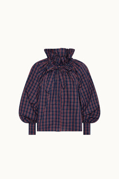 Camisa a cuadros azul y roja confeccionada en un tejido 100% algodón. Cuello con volante y lazo, mangas abullonadas y puños con volantes.