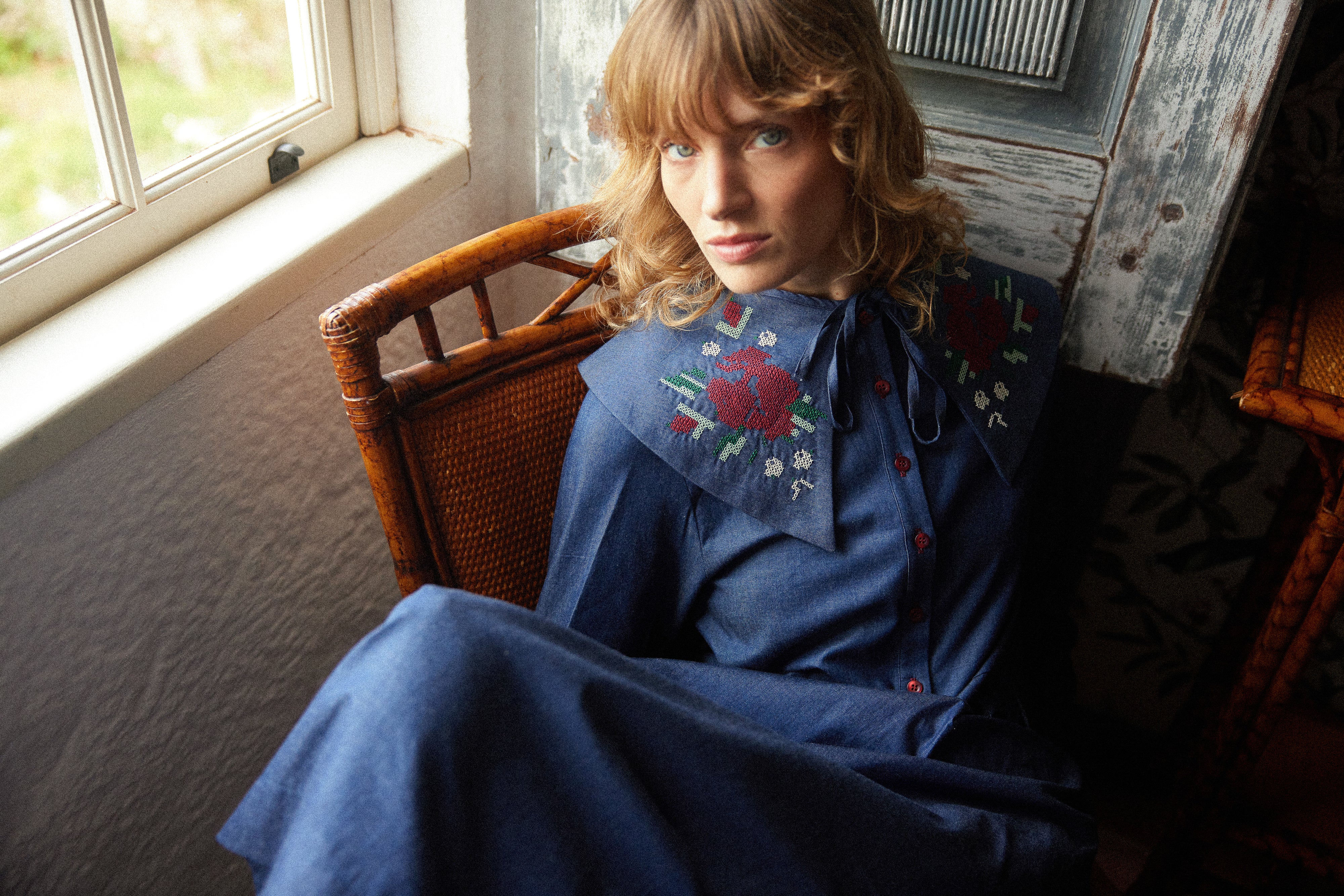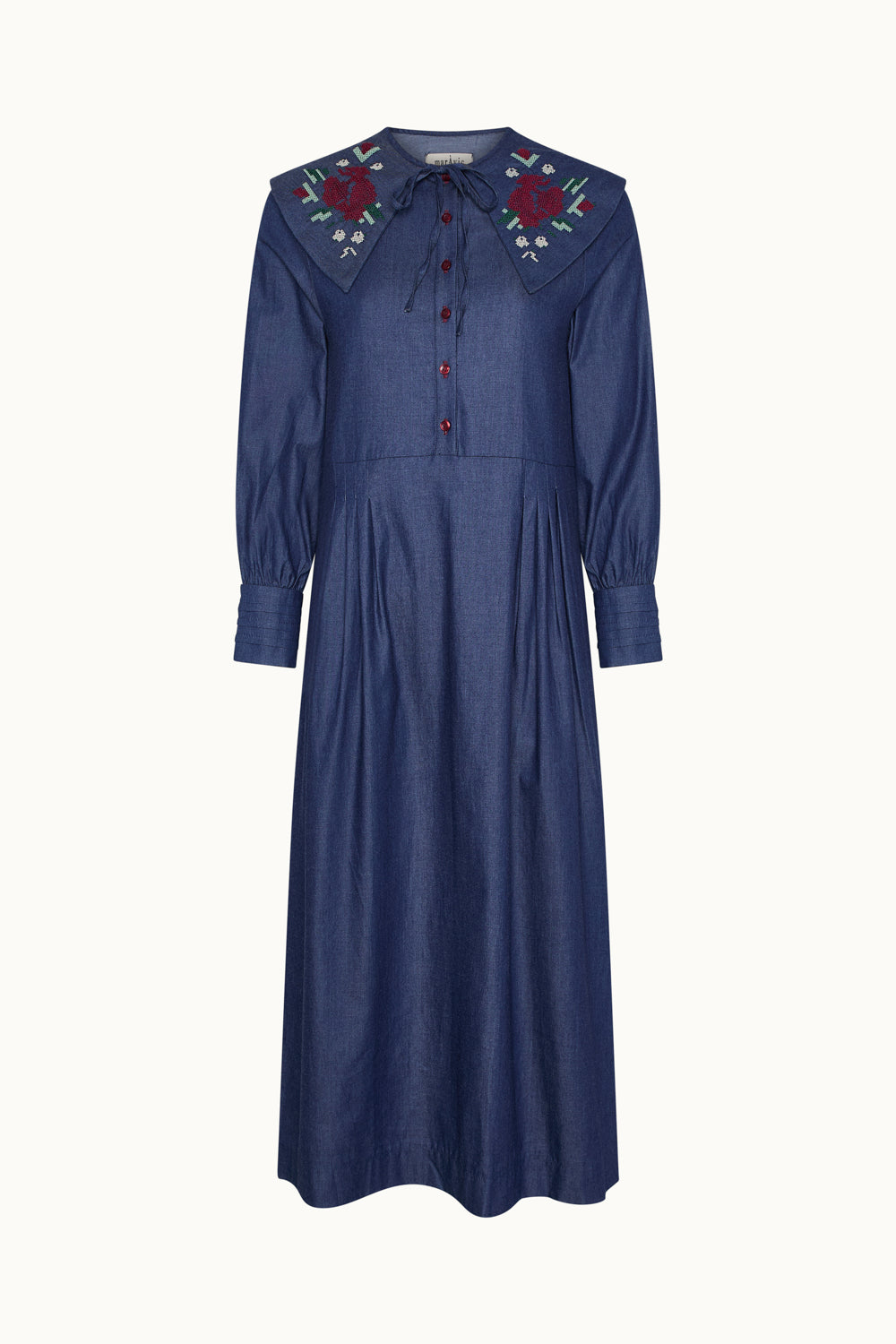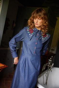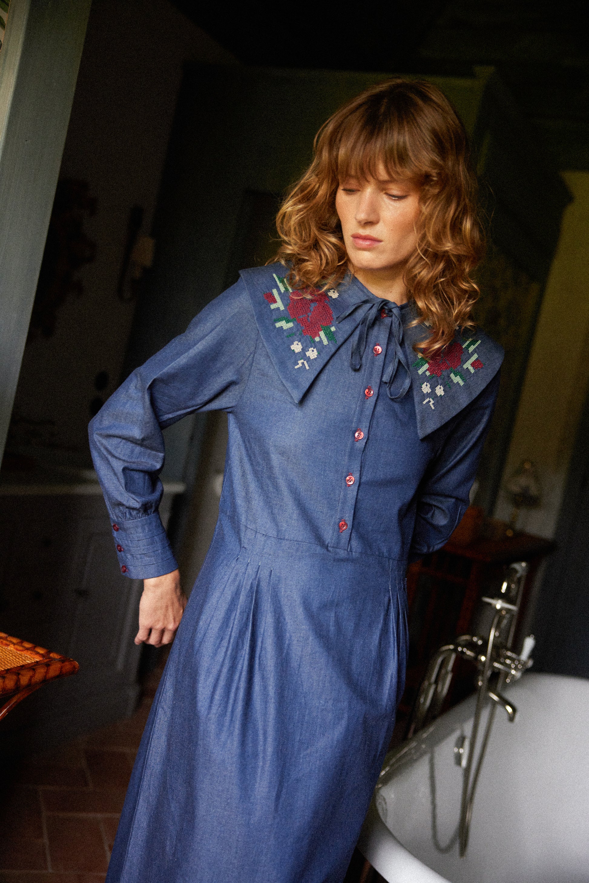 Vestido vaquero con cuello babero bordado con flores. Corte en la cintura y parte superior cerrada con botones. Puños con detalles cerrados con botones.