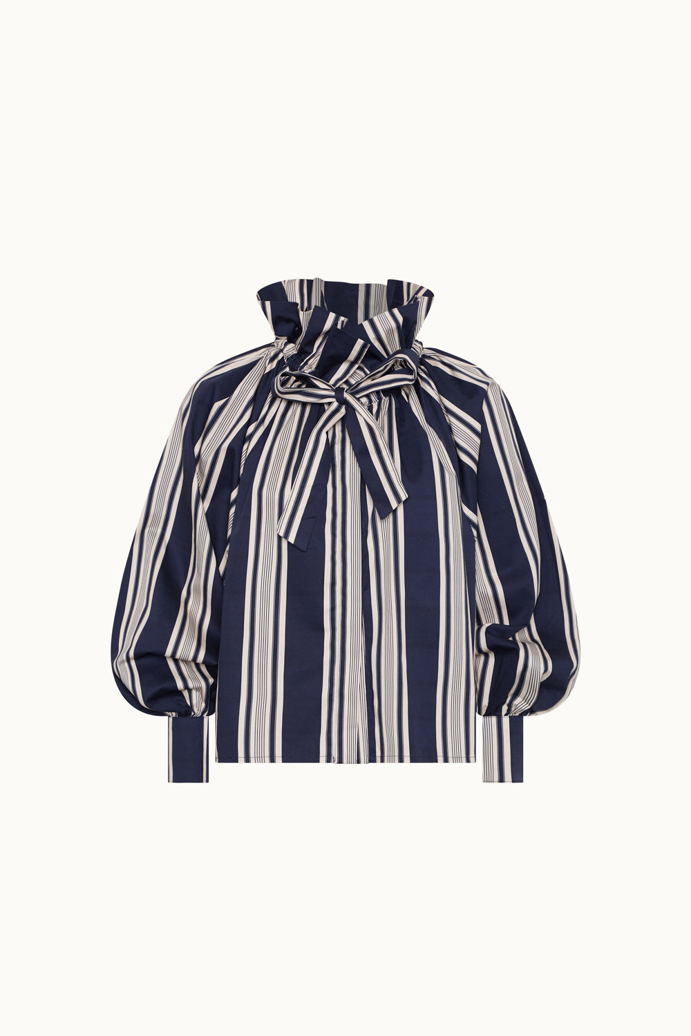 Camisa a rayas azul y blanca. Cuello con volante y lazo. Mangas abullonadas terminadas en puño. Cuello adornado con u...