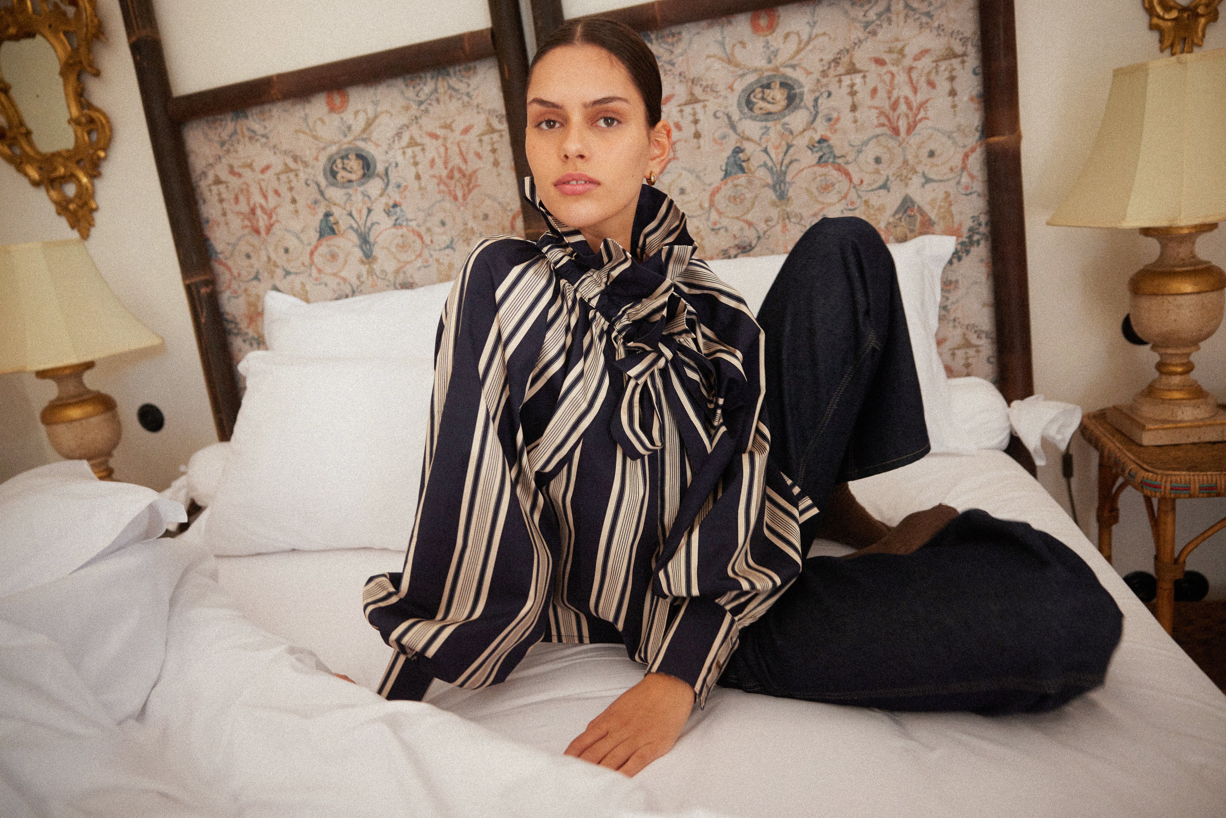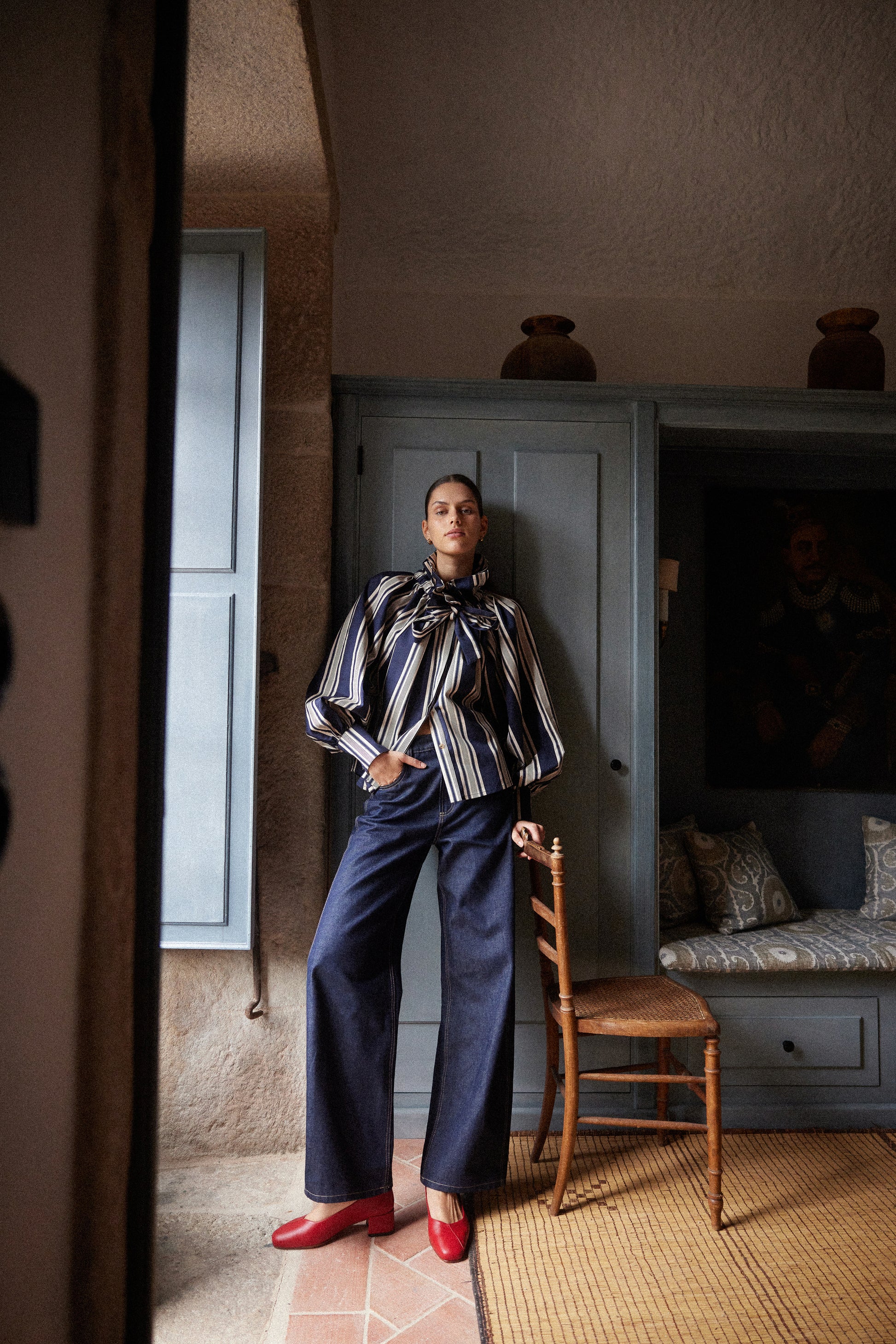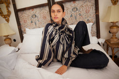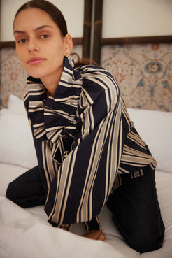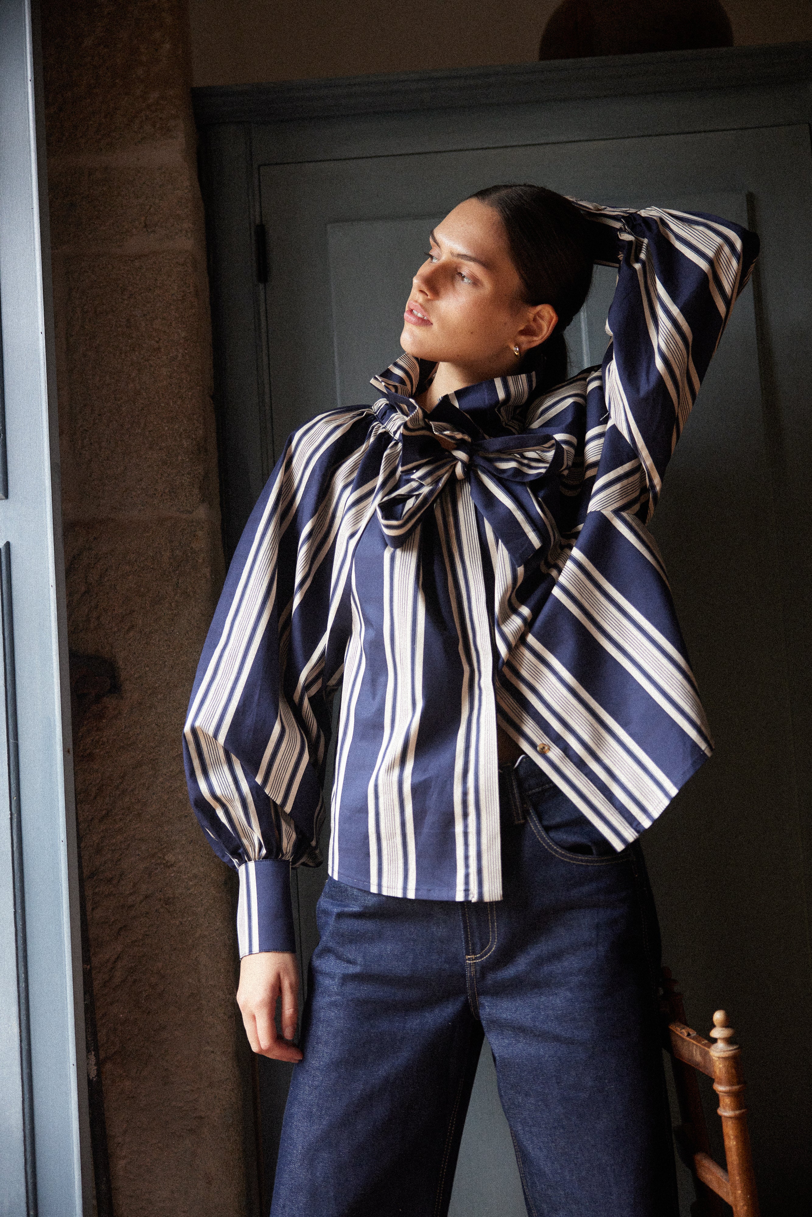 Camisa a rayas azul y blanca. Cuello con volante y lazo. Mangas abullonadas terminadas en puño. Cuello adornado con una flor de accesorio. Confeccionada en 100% algodón.