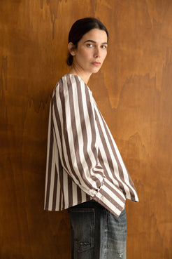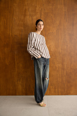 Sobrecamisa confeccionada en 100% algodón con mangas abullonadas y terminadas en puño. Cierre con botones con el mismo tejido en el delantero que le aportan elegancia a la pieza. Con estampado de rayas crema y marrón. Una prenda perfecta para cualquier ocasión.